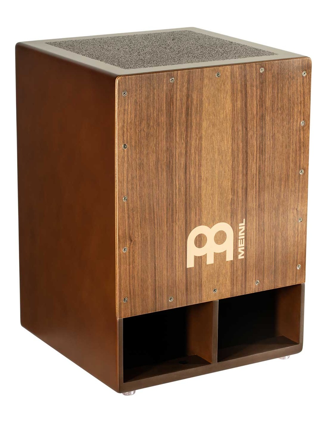 CAJÓN ESPECIAL 'Cajón con subwoofer con tapa de madera de nogal. Este cajón con el nombre apropiado ''Subwoofer'' cajón está diseñado para maximizar la proyección de bajos. En situaciones de directo echamos de menos tener un extra de esas frecuencias. Además de los modelos de cajón comunes, el cajón Subwoofer presenta una apertura de sonido en la parte frontal con una construcción que refleja los graves en el interior. Además, es un poco más grande que un cajón común. Esta construcción especial le da al cajón un amplio rango de sonidos potentes, cálidos y bajos mientras que conserva unos agudos ricos y cortantes. Un hermoso instrumento.