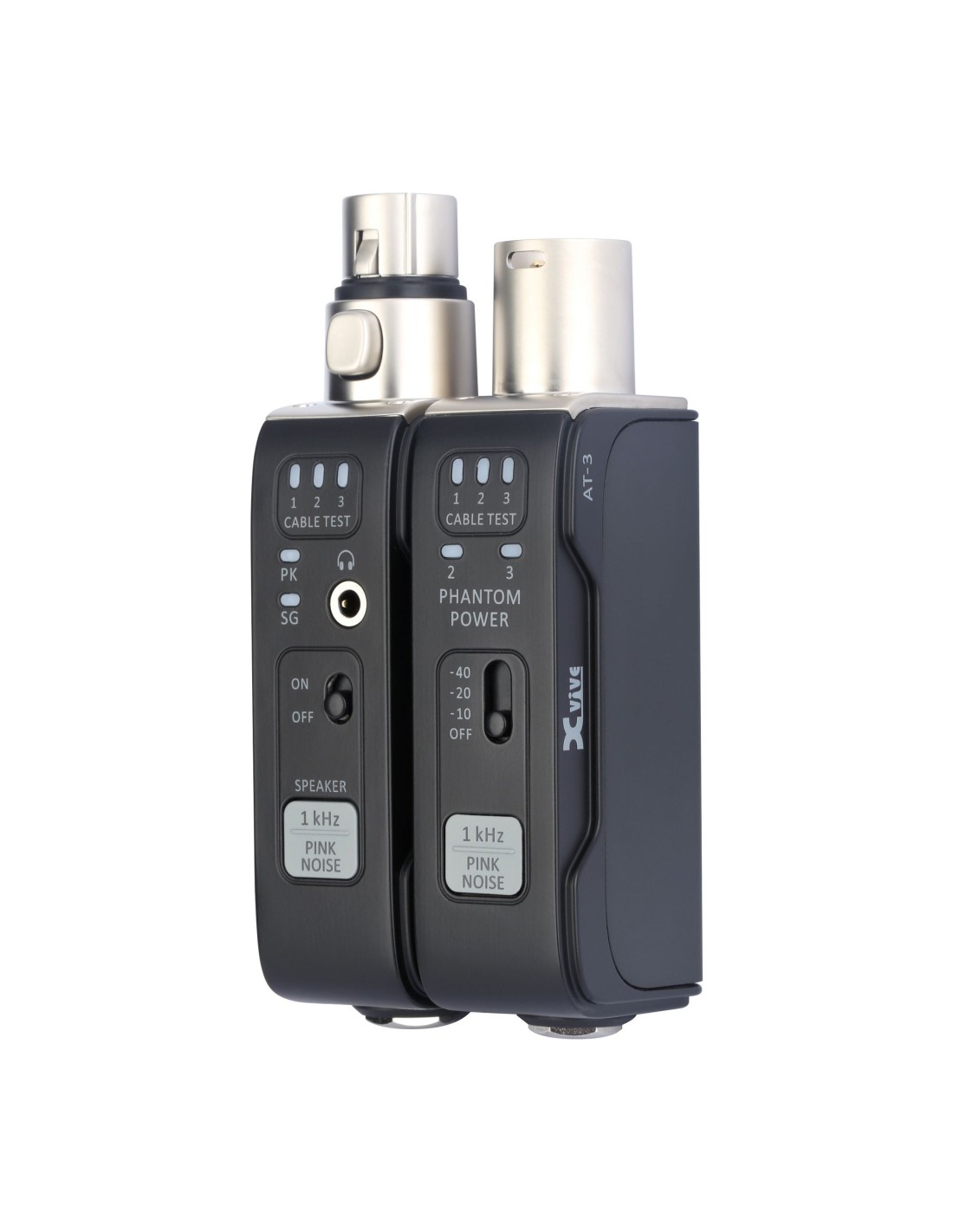 El AT-3 es la herramienta de prueba de audio definitiva de XVIVE, compuesta por una unidad XLR hembra y una unidad XLR macho. Cada unidad puede funcionar de forma independiente, lo que ofrece la máxima flexibilidad para una gran variedad de aplicaciones de prueba. La unidad XLR macho permite generar señales (tono de 1 kHz o ruido rosa), transmitirlas a través de conectores XLR y jack de 6,35 mm, y detectar la alimentación fantasma. La unidad XLR hembra ofrece medición del nivel de entrada XLR, generación de señales (salida al altavoz integrado y a la toma de auriculares de 3,5 mm) y monitorización de la entrada de audio.