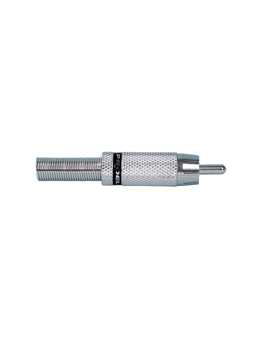 CONECTOR RCA Conector aéreo RCA macho con cuello en latón niquelado y muelle pasa cables flexible de 6,2mm. Anillo terminal en negro.