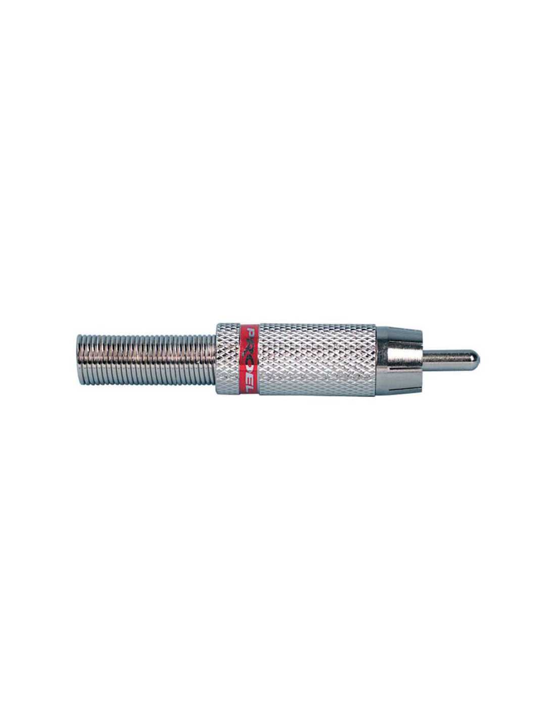 CONECTOR RCA Conector aéreo RCA macho con cuello en latón niquelado y muelle pasa cables flexible de 6,2mm. Anillo terminal en rojo.