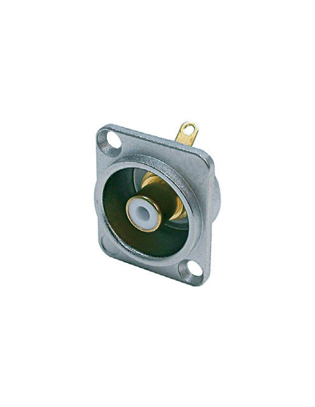 CONECTOR RCA Conector hembra de panel RCA con base cuadrada. Contactos y cuerpo dorados, conector hembra aisladoeléctricamente del alojamiento, para soldar. Color anillo de aislamiento: blanco