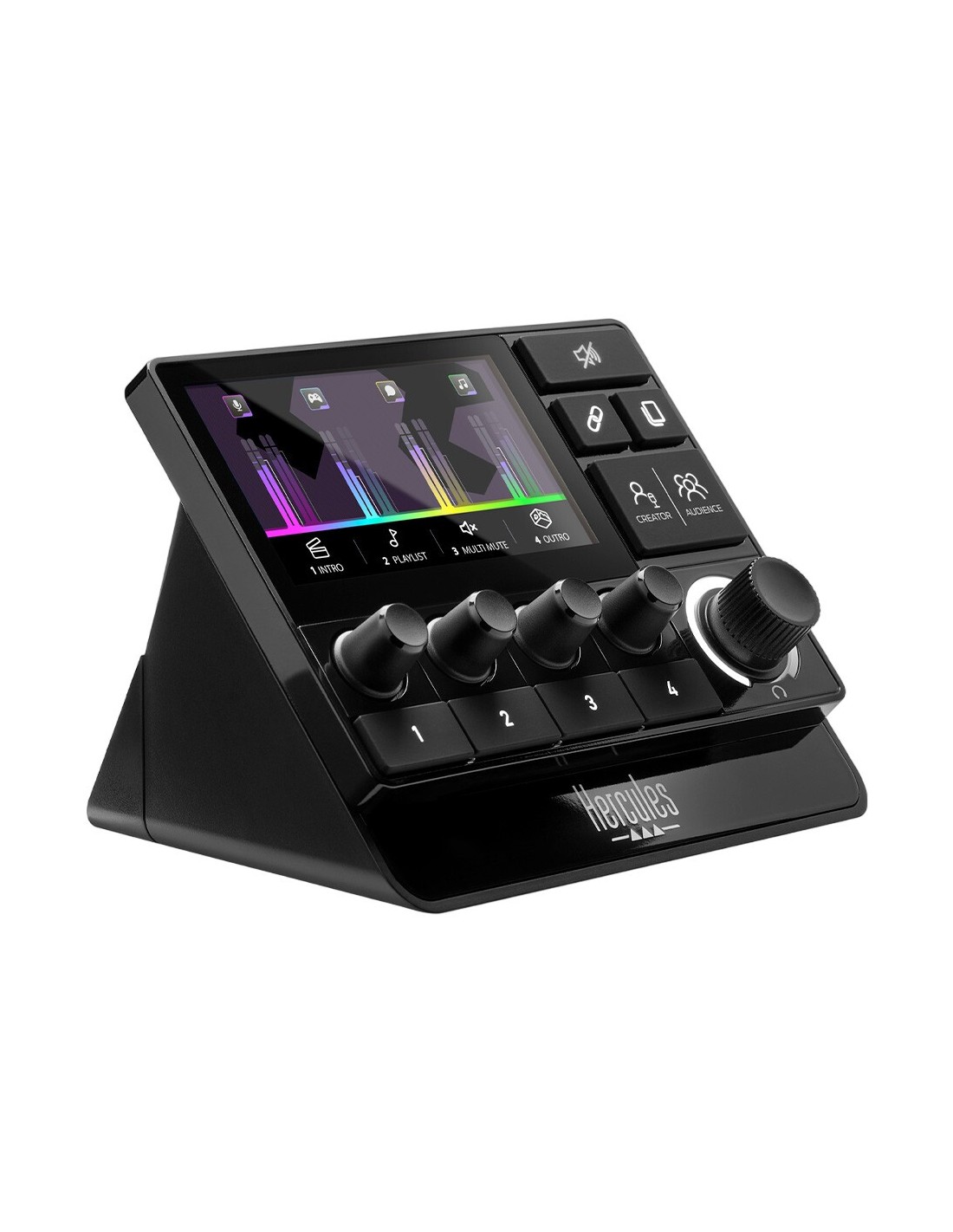 CONVERSOR AD / DA Hercules Stream 200 XLR es un controlador de audio que cuenta con una tarjeta de sonido integrada, lo que permite a los streamers separar la mezcla de audio que están escuchando de la mezcla que se reproduce para su público.Gracias a este controlador de audio con pantalla LCD integrada, podrás gestionar todas tus fuentes de audio en tiempo real: juegos, software de chat, música, micrófono XLR, consola de videojuegos, un segundo ordenador y mucho más. Hercules Stream 200 XLR te permite disfrutar de una experiencia personalizada viendo y controlando individualmente el nivel de sonido de cada pista de audio, ¡para ti y tu público! ¡De manera instantánea, habilita, baja o sube el volumen, silencia o activa el sonido!Fondos e iconos personalizadosElección de colores y estilos para indicadores visuales1 botón SILENCIAR TODOBotón de enlace de controlBotón de gestión de páginaVisualizar acciones definidas y cambiar iconosBotón de cambio de mezcla para el creador/públicoCodificador de volumen de auricularesBotones de acciónCodificadores de volumen pulsar para silenciar2 páginas de 4 pistas2 x 2 indicadores visuales estéreo dinámicos para cada pista Control de sonido completo y fácil de usar en tiempo real4 codificadores de gestión de nivel de volumen con soporte de silencio, 2 páginas de 4 pistas cada una botón de gestión de páginas, codificador de volumen de auriculares, botón Silenciar todo, control de audio desde otros dispositivos consola de videojuegos, segundo ordenador, etc., 1 salida de auriculares, 1 entrada de micrófono XLR, 1 conector óptico, 1 puerto de entrada de línea, 1 puerto de salida de líneaBotones del iniciador de acciones prácticas4 botones de acción asignables: silencio múltiple, iniciador de URL, cambio de escena, etc.Dispositivo totalmente personalizableElección de colores y estilos para indicadores visuales Imágenes e iconos personalizados Gestión de perfilesAjustes de audio avanzadosLista de silencio, Solo, Pulsar para silenciar, preamplificador para sonido vocal de alta fidelidadBotón de mezcla para el creador2 x 2 indicadores visuales estéreo para cada pista, botón de cambio de mezcla para el creador/público, botón de enlace de control de volumenSoftware integradoApp Hercules Stream Control. Aplicaciones principales de streaming preintegradas OBS, Streamlabs, guía integrada asistencia en configuración, producto plugandplay, interfaz de arrastrar y soltar.EspecificacionesDimensiones: 155 x 110 x 115 mm / 4,6 x 4,3 x 3,7 pulgadasPeso: 543 gPANTALLA: 4,3 pulgadas / Tipo de LCD: TFT4 codificadores, 4 botones de acción, botón de encendido/apagado de la pantalla, botón de pánico, botón de cambio de página, botón de enlace: botón Creator/AudienceOrdenador con Windows: a través de USB cable incluidoFuente de alimentación a través del cable USB incluidoHERCULES STREAM CONTROLWindows 10 o superior, puerto USB IncluyeHERCULES STREAM 200 XLRHercules Mic PreampCable de alimentación USB tipo CEnlace para descargar la aplicación Hercules Stream ControlTarjeta de garantía