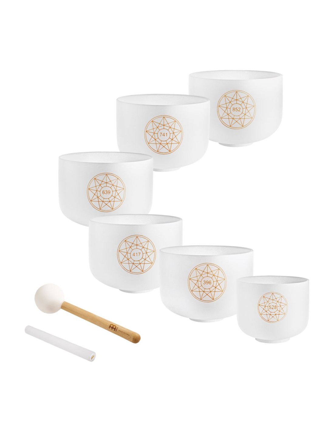 CUENCOS TIBETANOS Los cuencos de cristal Solfeggio de energ¡a s¢nica de Meinl esmerilados en blanco est n hechos con frecuencias antiguas. Las frecuencias de Solfeggio son vibraciones de sonidos que se dice que tienen un efecto curativo y que promueve la salud en nuestro cuerpo, mente y alma. Ya en la antigedad estas frecuencias eran conocidas y utilizadas para el tratamiento de enfermedades f¡sicas y ps¡quicas. Por ejemplo, los monjes utilizaron estas frecuencias hist¢ricas en sus corales gregorianos y vieron un efecto curativo en la transmisi¢n de las vibraciones al cuerpo. Estos cuencos tibetanos de escarcha blanca hechos de cuarzo de alta pureza crean un aura muy agradable con su sonido y dise¤o. Su tono esf‚rico de larga duraci¢n se extiende cuando el cuenco tibetano se golpea suavemente o se frota para que la energ¡a se sienta en todo el entorno. En este juego Solfeggio de 6 piezas, todos los cuencos tibetanos de cristal se entregan con un anillo de silicona para evitar posibles impactos y garantizar la mejor resonancia. Una ca¤a mediana (CSBRM) y un mazo (CSBM) te permiten empezar a jugar de inmediato. Puede usar cuencos de cristal para una variedad de prop¢sitos: curaci¢n de chakras, meditaci¢n, terapia de sonido, yoga, mejorar el Fengshui de su hogar, ajustar su estado emocional o incluso para decorar la habitaci¢n. Frecuencias de solfeo: Ut (Utquent laxis): 396 Hz contribuye a la liberaci¢n de la culpa y el miedo y transforma la tristeza en alegr¡a. Re (Resonare fibris): 417 Hz ayuda a superar experiencias traum ticas y simplifica el cambio. Mi (Mira gestorum): 528 Hz influye positivamente en la vida. La frecuencia representa transformaci¢n, milagros y se¤ales, y seg£n algunos estudios, incluso parece ser capaz de afectar nuestro ADN. Fa (Famuli tuorum): 639 Hz representa relaciones armoniosas, amor, tolerancia y comunicaci¢n. Escuchar esta frecuencia armoniza las relaciones entre las personas y promueve el equilibrio interior. G (Solive polluti): 741 Hz representa la intuici¢n, la resoluci¢n de problemas, la limpieza y el aumento de la conciencia. Escuchar regularmente esta frecuencia de Solfeggio ayuda a vivir de manera m s saludable y a impulsar cambios en el estilo de vida, por ejemplo, en el rea de la nutrici¢n. A (Labii reatum): 852 Hz apoya el retorno a la armon¡a mental y espiritual. La escucha intensiva de esta frecuencia proporciona una apertura de conciencia.