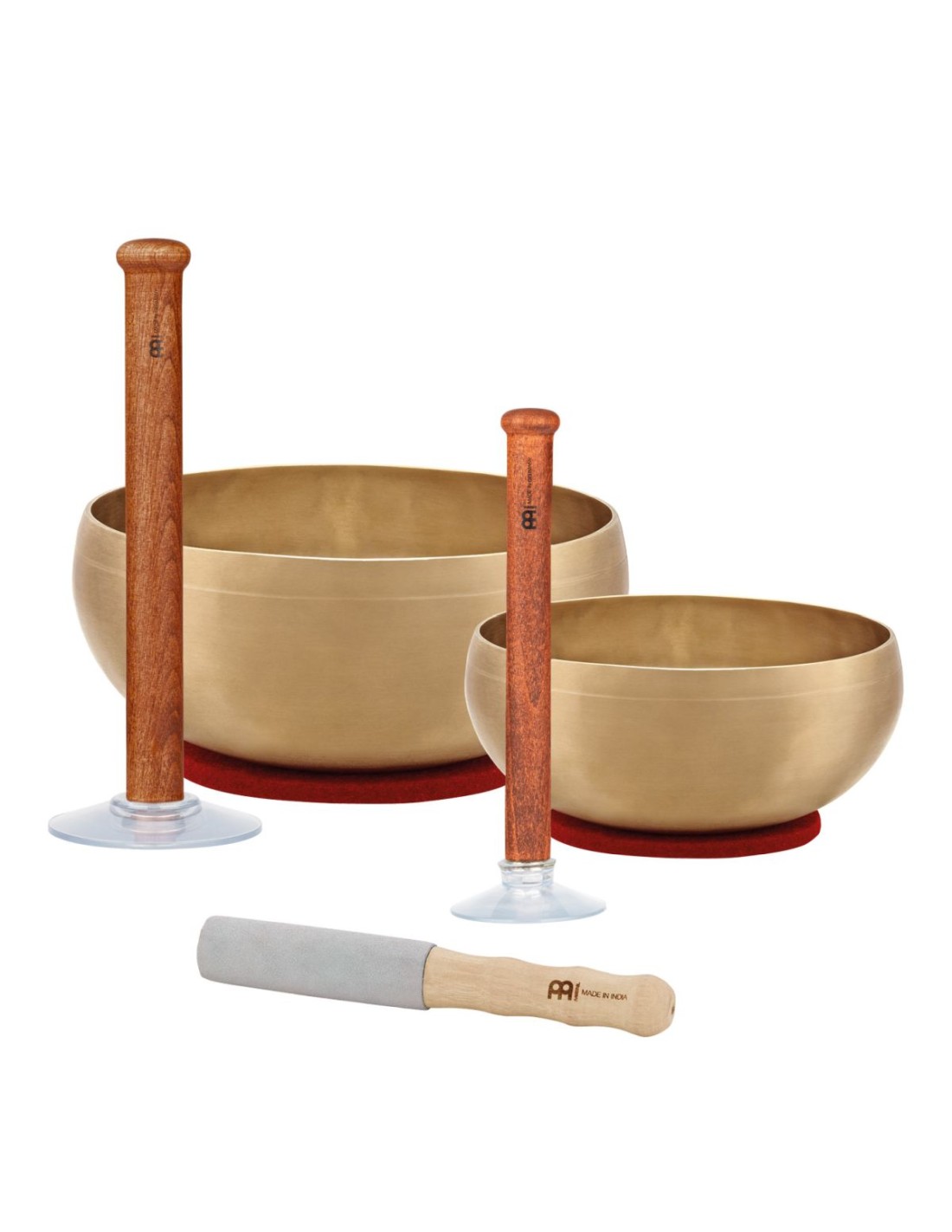CUENCOS TIBETANOS Naturales pero altamente refinados, los cuencos tibetanos de la serie Cosmos de Meinl Sonic Energy est n dise¤ados para adaptarse a los profesionales de la meditaci¢n y la terapia de sonido. Con un dise¤o de panza creado a partir de martillazos adicionales, estos cuencos generan un tono profundo sostenido que llenar cualquier habitaci¢n con sonido ambiental. Forjamos estas obras maestras de aleaci¢n de bronce en la India para producir un sonido relajante de larga duraci¢n cuando se golpea o se frota con un mazo de cuenco tibetano. Esta aleaci¢n llena el espacio a su alrededor con ondas sonoras et‚reas de matices calmantes. Este juego de dos piezas viene con dos ventosas que le permiten mover los tazones libremente durante los ba¤os de sonido o la terapia para concentrarse en diferentes partes del cuerpo mientras mantiene la resonancia. Tambi‚n se incluye nuestro popular mazo resonante. Hecho de madera maciza y revestido con cuero de gamuza, este mazo resonante de cuenco tibetano es perfecto para golpear o frotar suavemente los cuencos tibetanos para lograr un tono puro, relajante y resonante. Tambi‚n se incluyen dos anillos de fieltro para apoyar los cuencos tibetanos y dos fundas blandas para un almacenamiento y transporte ¢ptimos. Nota del fabricante: no sostenga ning£n cuenco sobre la cara o el cuerpo con las ventosas. Antes de utilizar las ventosas, los cuencos tibetanos deben estar completamente limpios de polvo y las ventosas deben humedecerse ligeramente. Las ventosas se presionan en el centro de los cuencos tibetanos y se levantan con las varillas.