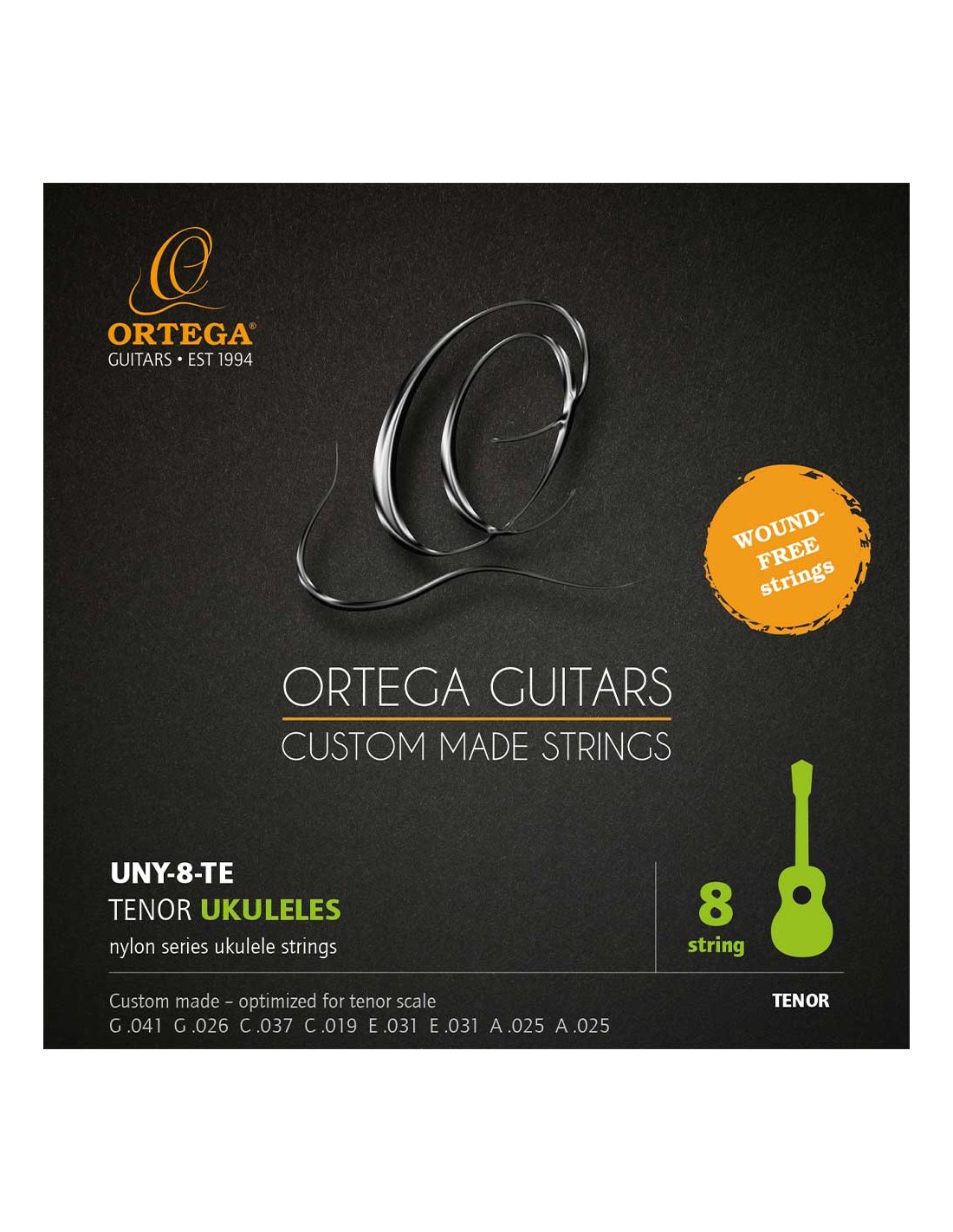 JUEGO CUERDAS UKELELE Juego de cuerdas de ukelele tenor UNY-8-TE para modelos de 8 cuerdas (4 cuerdas dobladas). Fabricadas en Italia en colaboración con Aquila. Sonido meloso pero con pegada. Gran proyección, afinación precisa, gran establilidad y comodidad. Compatibles con ukelele Ortega Eclipse-TE8 y ukes tenores de 8 cuerdas de otras marcas.