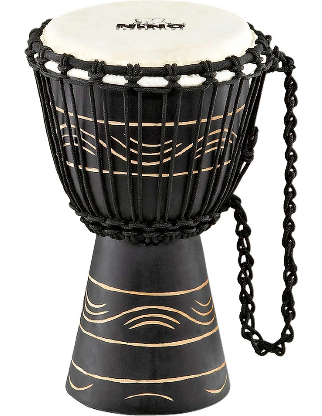 DJEMBE Los originales djembes de madera NINO ® acabados al estilo de cuerda africana, están tallados en una sola pieza sólida de madera de caoba procedente de una plantación. Estos instrumentos de alta calidad se hacen a mano poniendo gran atención al detalle para proporcionar un sonido excepcional. Hecho en caoba. Tamaño XS.