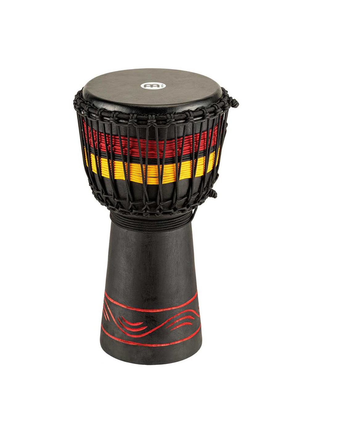 DJEMBE 'Djembé de madera 10'' ADJ7-M. Tallado de una pieza sólida de caoba cultivada en plantación . Cuerpo negro hecho de caoba (swietenia macrophylla) decorado a mano con adornos tallados en negro. Afinado con cuerda de nylon de 4mm. Sección central envuelta con cuerdas en amarillo y rojo fire rhythm series.