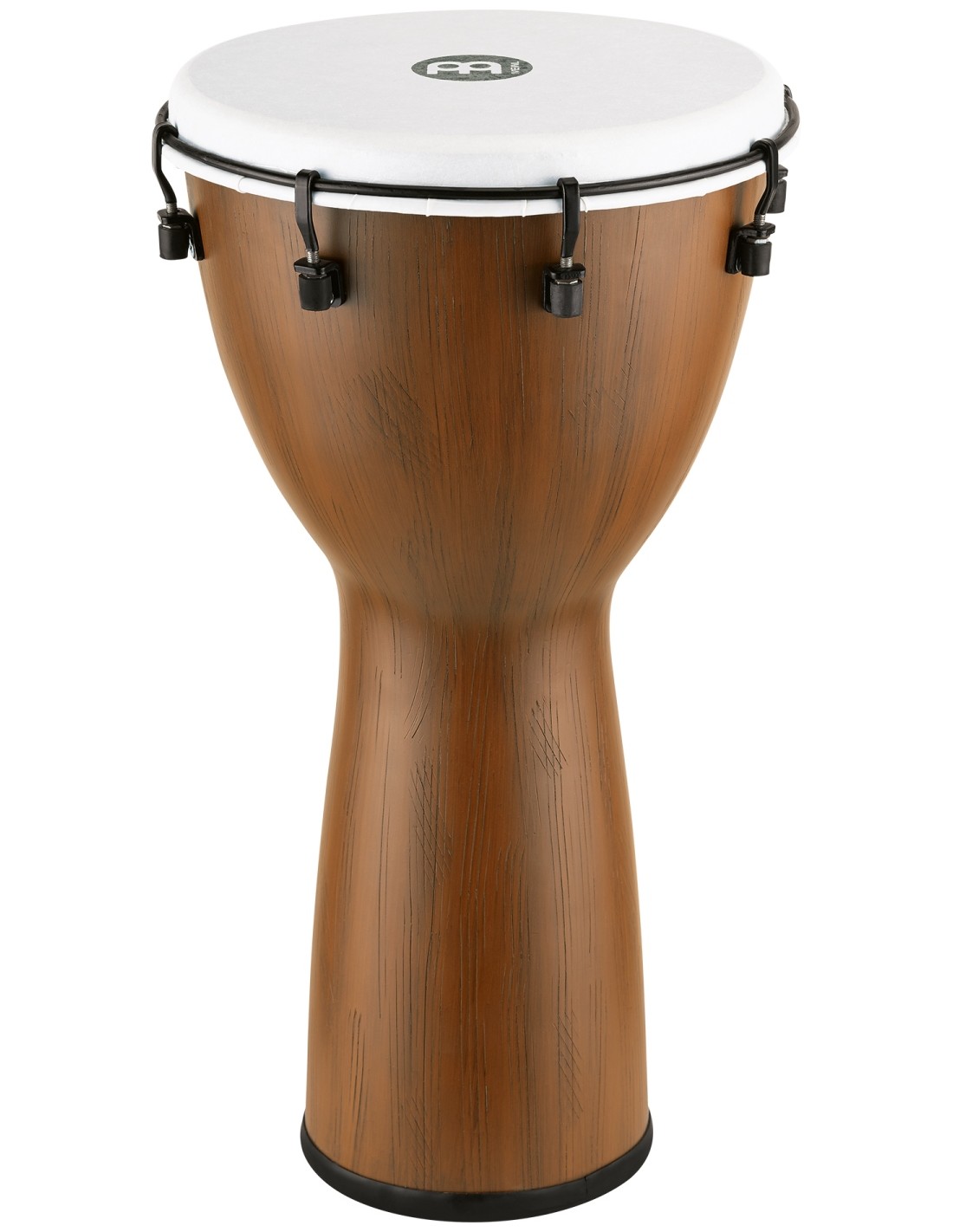 DJEMBE 'Djembé de 12'' ADJ12-BW. Los Djembes de la Serie Alpine de Meinl están diseñados para ser portados a cualquier parte. El casco está hecha de plástico, por lo que el instrumento es extremadamente liviano y robusto. El uso de plástico dio a los desarrolladores de producto en Meinl la oportunidad de ahorrar un 20% más de peso en comparación con el modelo de fibra de vidrio. Además, este material liviano también vibra de manera fácil lo que imprime al sonido agudos realmente vibrantes y graves increiblemente profundos. Como dato a destacar, el sistema de afinación mecánico nos permite encontrar el sonido perfecto de manera rápida.