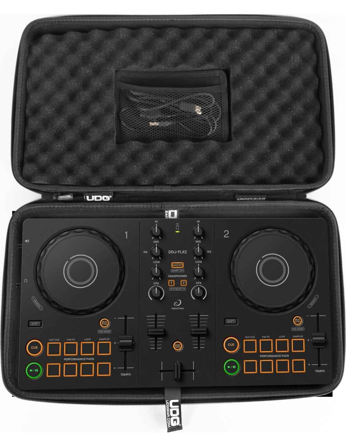 Maleta rígida UDG Hardcase para AlphaTheta DDJFLX2, diseñada para ofrecer protección profesional en un formato ligero y resistente. Fabricada en EVA moldeada Durashock con exterior en poliéster 600D repelente al agua y forro interior de felpa negra, protege el equipo frente a impactos, arañazos y líquidos.