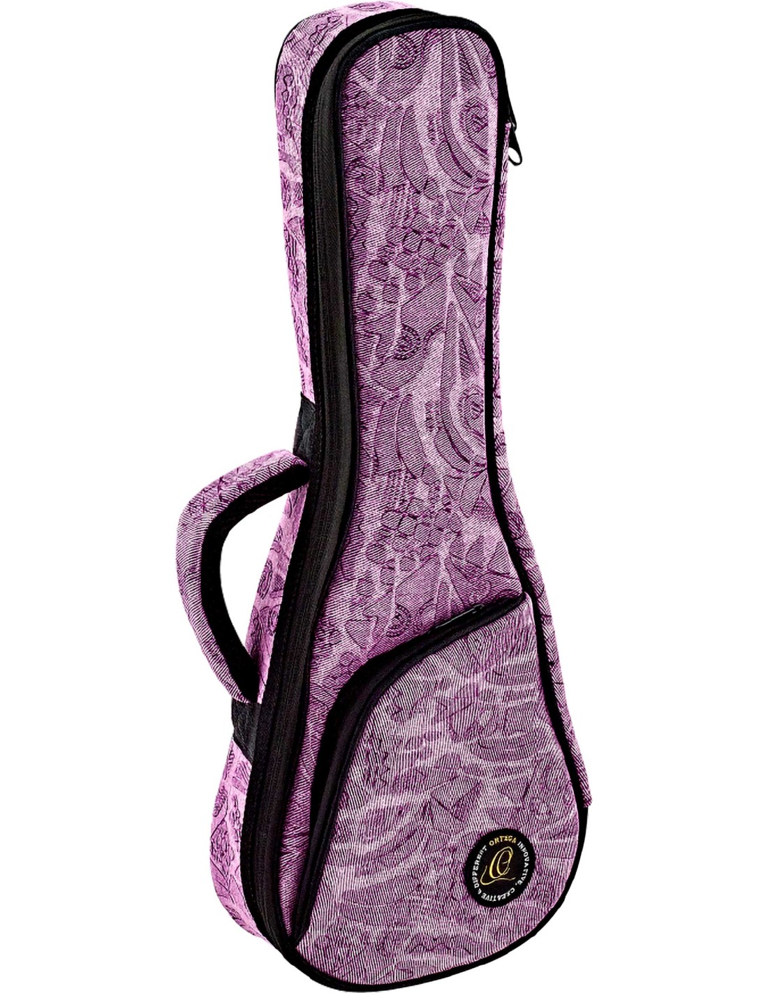FUNDA PARA UKELELE Funda estampada para ukelele soprano con exterior de algodón estilo ``jean´´ e interior de nylon. 12 mm de acolchado. Con correas estilo mochila. Compartimento frontal. Color Purple Jean