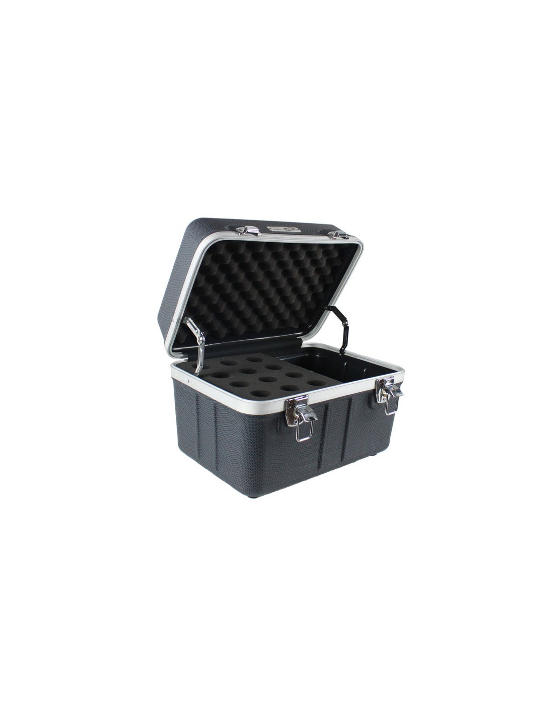 ESTUCHE PARA MICROFONO/S Maleta Proel FOABSMIC12. Estuche para 12 micrófonos hecho de 'Polietileno FORCE' con inserto de espuma moldeada para la inserción de los micrófonos yun práctico compartimiento lateral para cables y accesorios.