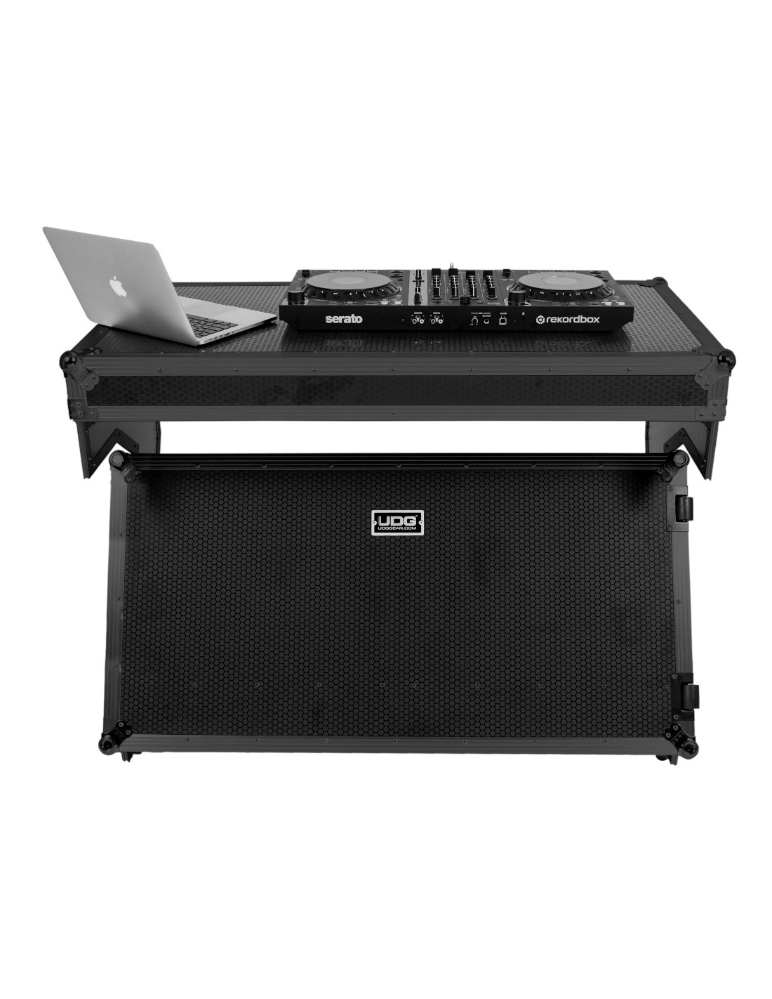 FLIGHT CASE PARA EQUIPO DJ UDG Ultimate Flight Case/mesa de DJ plegable portátil Z-Style. Construido con madera contrachapada resistente de 9 mm de espesor. lados exteriores laminados en acabado negro 'Stage Grip' con patrón hexagonal. Cuanto con ruedas en los bordes para facilitar el transporte, y asas con resorte para una elevación y carga seguras.