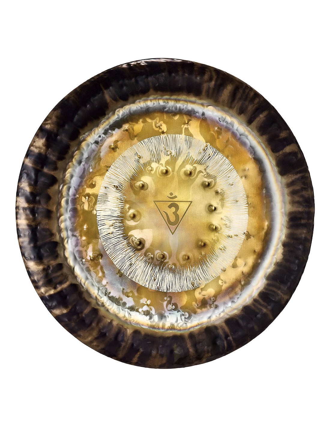 GONGS 'G24BC6. Brow Chakra Gong, 24'' / 60 cm, 221,23 Hz / A2. Los Chakra Gongs de Sonic Energy son piezas de artesanía hechas 100% a mano en Alemania. Cada gong está afinado en una frecuencia específica basada en los cálculo de Hans Coustó de la ''Octava Cósmica'' y ayudan a activar el respectivo chakra. El trabajado martilleado suma estimulación visual y crea el innegable carácter sonoro para despertar tus sensaciones. Finalmente una técnica especial de chorro de arena permite proyectar el símbolo del chakra en el centro de cada gong.