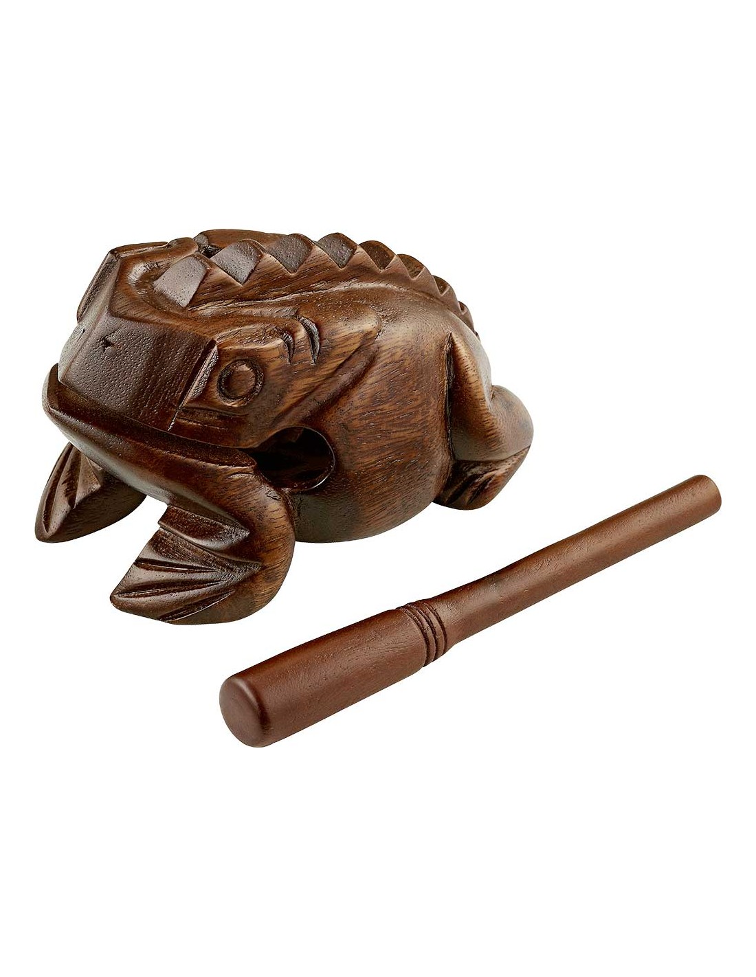 GUIRO Rana de percusión tamaño grande color marrón FROG-L. Para tocarla como un bloque de madera o un güiro. Tono bajo. Raspador incluido.