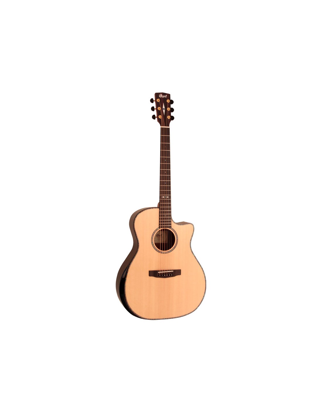 GUITARRA ACUSTICA DE 6 CUERDAS Guitarra electro-acústica con cutaway tipo Auditorium. Bevel cut o comfort cut para mayor comodidad al apoyar el brazo. Tapa sólida de abeto de sitka. Aros y fondo de Pau Ferro con fondo arqueado. Mástil de caoba. Diapasón de Ovangkol de 20 trastes. Escala 25,3 pulgadas. Clavijeros die casting. Puente de Ovangkol con pins de ébano. Previo L.R. Baggs EAS-VTC. Acabado natural brillante.