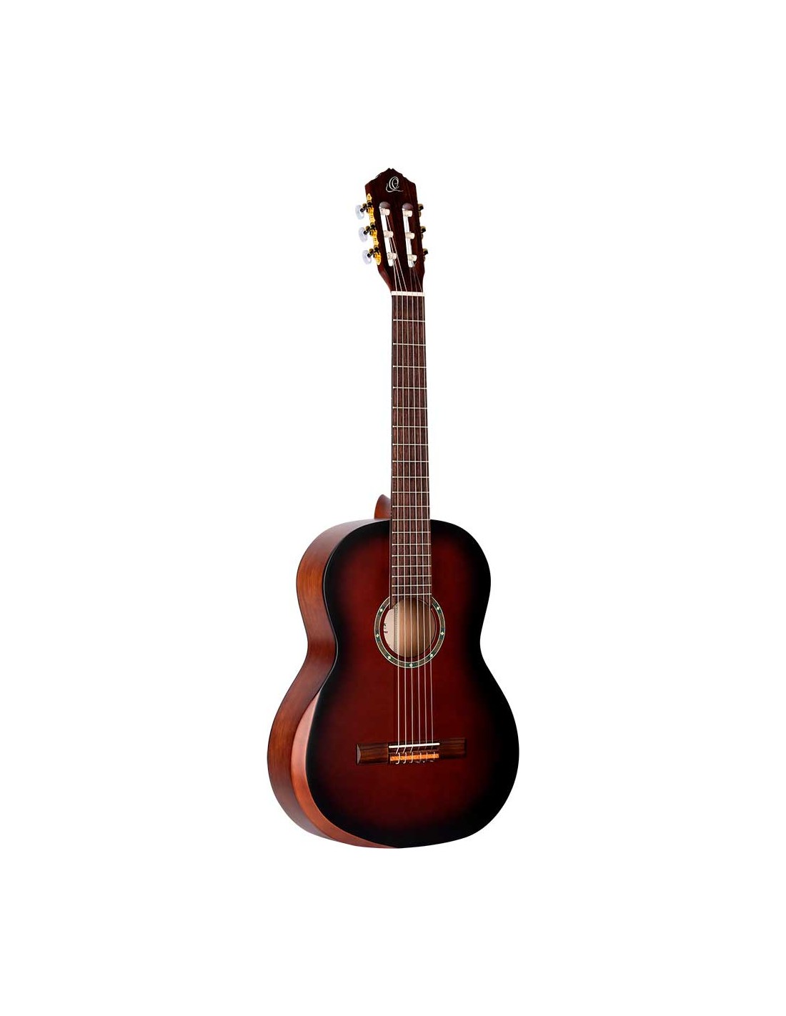 GUITARRA CLÁSICA 4/4 R55DLX-BFT Guitarra clásica 4/4 con tapa maciza para iniciados y estudiantes. Con rebaje estilo ``armrest´´ en su borde superior que aport auna mayor comodidad en la ejecución del brazo derecho al tocar sentado. Tapa maciza de abeto Engelmann con acabado Bourbon Fade satinado en poro abierto. Aros y fondo en madera de catalpa con acabado satinado. Mastil de nato en acabado satinado con alma de doble sentido. Binding en ABS negro. Lamina de nogal sobre pala. Diapasón y puente de nogal. Escala de 650 mm (25.59 pulgadas). Cejuela de 52 mm.