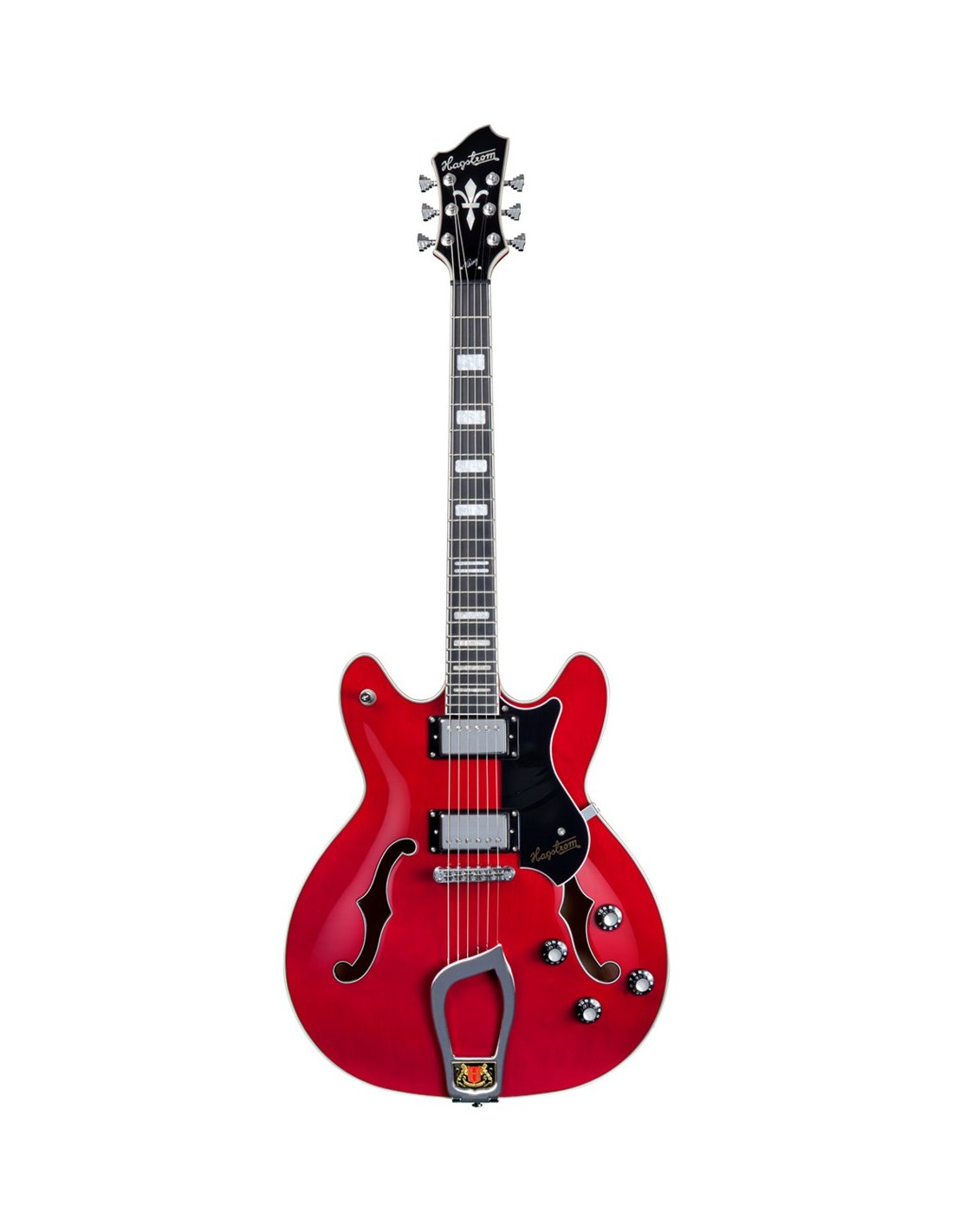 GUITARRA DE CUERPO SEMI-HUECO 'Viking - Wild Cherry Transparent, Contoured Ply-Maple Semi-Hollow body, Maple Set-Neck, Long throw T-O-M Bridge, Hagstrom Trapeeze, 2 x HJ50 Alnico 5, 2 x Vol RC-Circuit, 2 x Tone, 3-Way Pick-up Toggle Switch, 24.75'' Scale Length, H-Expander Truss Rod, 18:1 Hagstrom Tuners, Resinator Fretboard'