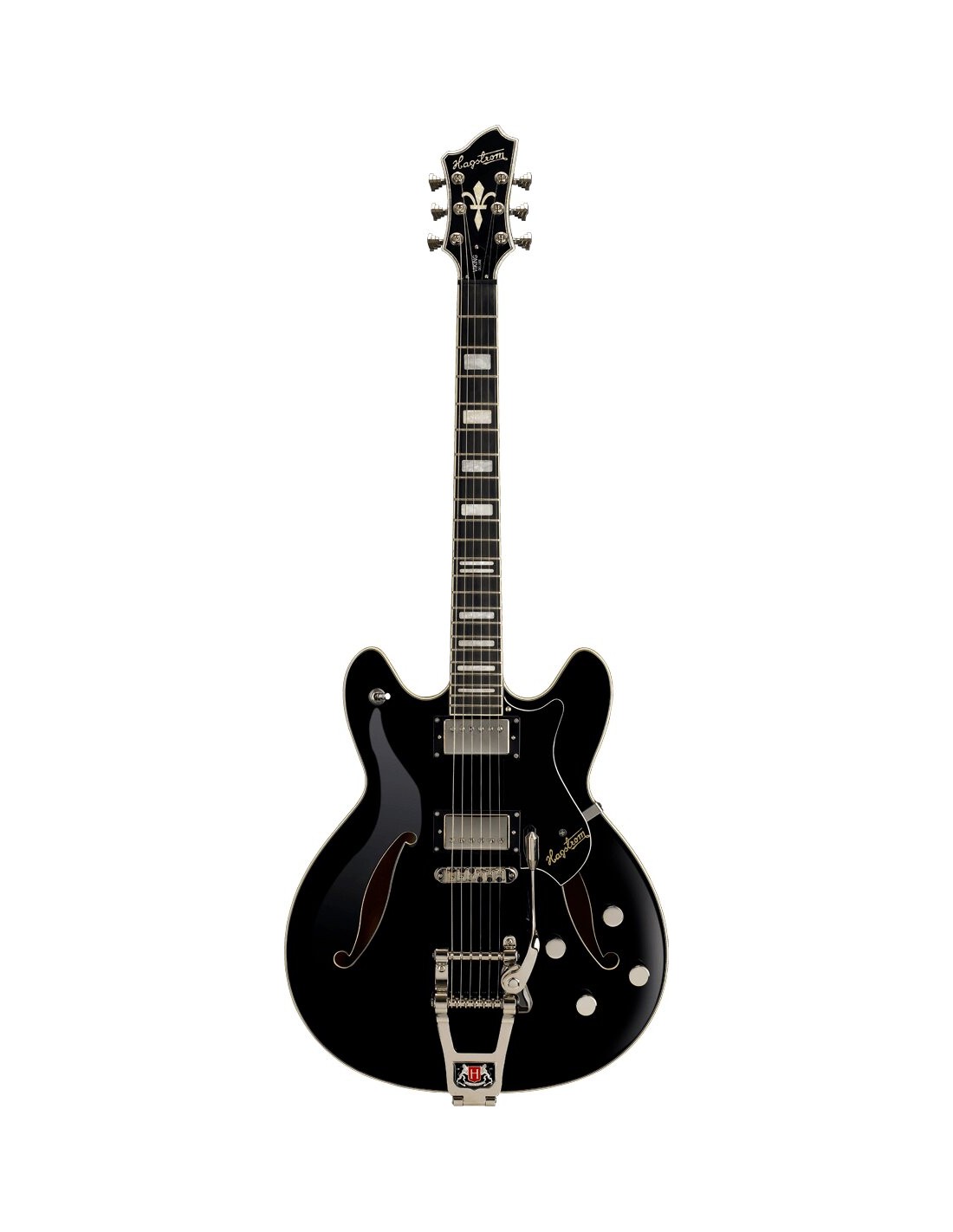 GUITARRA DE CUERPO SEMI-HUECO 'Tremar Viking DLX - Black Gloss, Contoured Ply-Maple Semi-Hollow body, Maple Set-Neck, Roller T-O-M Bridge, Hagstrom Tremar, 2 x HJ50 Alnico 5, 2 x Vol RC-Circuit, 2 x Tone, 3-Way Pick-up Toggle Switch, 24.75'' Scale Length, H-Expander Truss Rod, 18:1 Hagstrom Tuners, Resinator Fretboard'