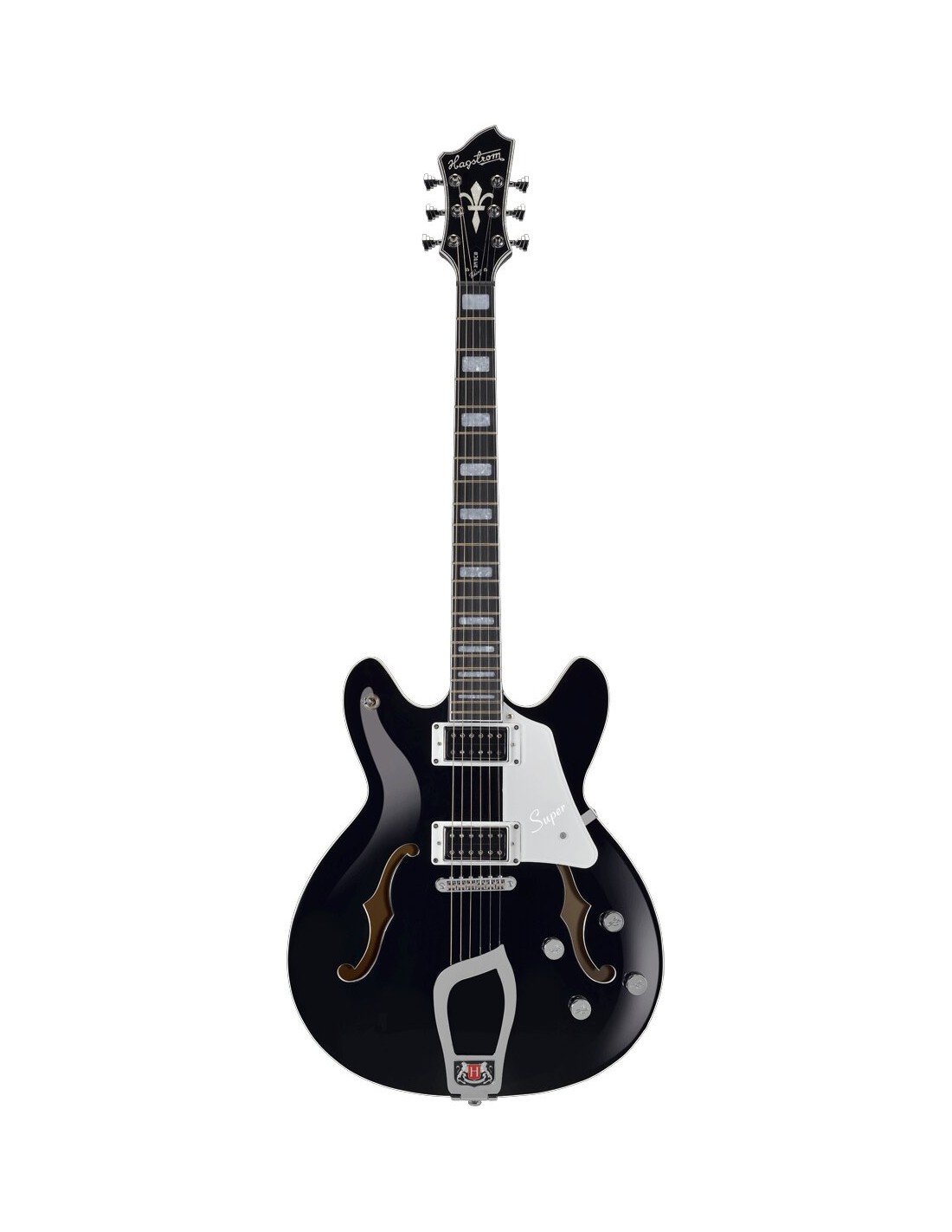 GUITARRA DE CUERPO SEMI-HUECO 'Super Viking - Black Gloss, Contoured Ply Flame Maple Semi-Hollow body, Maple Set-Neck, Long throw T-O-M Bridge, Hagstrom Trapeeze, 2 x HJ50 Alnico 5, 2 x Vol RC-Circuit, 2 x Tone (Push/Pulls - Coil Split), 3-Way Pick-up Toggle Switch, 25.50'' Scale Length, H-Expander Truss Rod, 18:1 Hagstrom Tuners, Resinator Fretboard'
