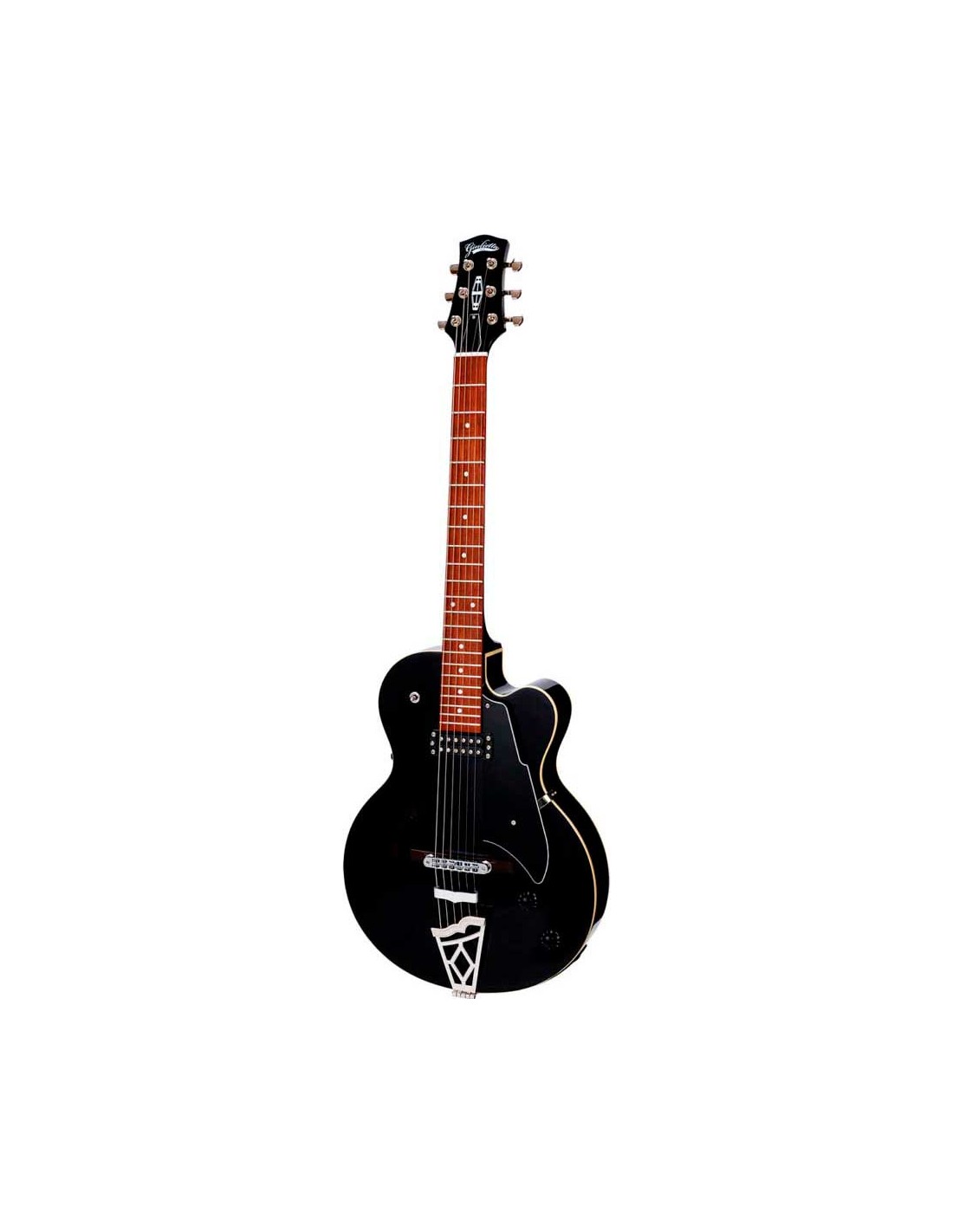 GUITARRA DE CUERPO HUECO La nueva guitarra acústica/eléctrica VOX Giulietta 3D incorpora el exclusivo sistema de modelado AEROS-D que ofrece nuevas dimensiones de sonido al diseño clásico archtop. El sistema VOX AEROS-D proporciona acceso instantáneo a una amplia gama de sonidos (18) acústicos, eléctricos y de sintetizador. 6 bancos de instrumentos con 3 variaciones cada uno, más 2 bancos de usuario para almacenar hasta 6 presets. 2 bancos para sonidos de eléctrica single coil y humbucker. 2 bancos para 6 sonidos de acústica, además de banjo, sitar, 12 cuerdas… Puente tipo Tune-O-Matic con piezo para sonidos acústicos. Pastilla humbucker VOX XLM para sonidos eléctricos. Efectos Drive y Reverb. Longitud de escala de 24,75’’. Cuerpo de 13,5’’ de ancho, con tapa archtop de arce, y aros y trasera de arce. 22 trastes. Mástil de caoba. Incluye funda.