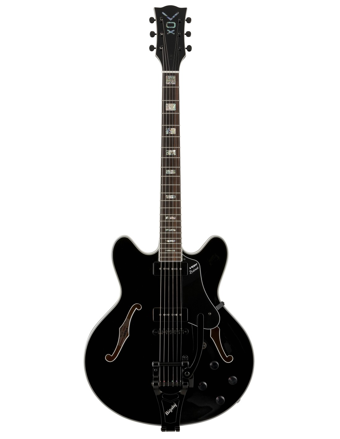 GUITARRA DE CUERPO SEMI-HUECO Guitarra Bobcat V90 con puente tailpiece con Bigsby. Este puente con Bigsby fue introducido en las guitarras en la década de 1940 y desde entonces ha sido un estándar dominante, utilizado en guitarras de muchos fabricantes. Probablemente el mayor mérito del Bigsby es cómo cautiva a los intérpretes a primera vista, con su aspecto rústico. En términos de sonido, al añadir el Bigsby a una guitarra aporta un brillo característico en el tono, con un sonido fuerte y con presencia. La Bobcat V90 es una guitarra de cuerpo semi-hollow con 2 pastillas soapbar V90. Con un diseño vintage. Golpeador y pastilla basado en el diseño original. Potenciómetros de aluminio como los originales. Logo VOX vertical en la pala como los modelos de los 60. Mástil set-neck. Puente tailpiece con Bigsby. Nuevas pastillas con una estética y sonidos retro. Imanes tipo Strat para un sonido brillante y con pegada. Cuerpo de arce. Bloque central de abeto. Mástil de caoba. Diapasón de ébano de Indonesia. 2 controles de volumen y 2 de tono. Peso: 3kg. Acabado Jet Black.