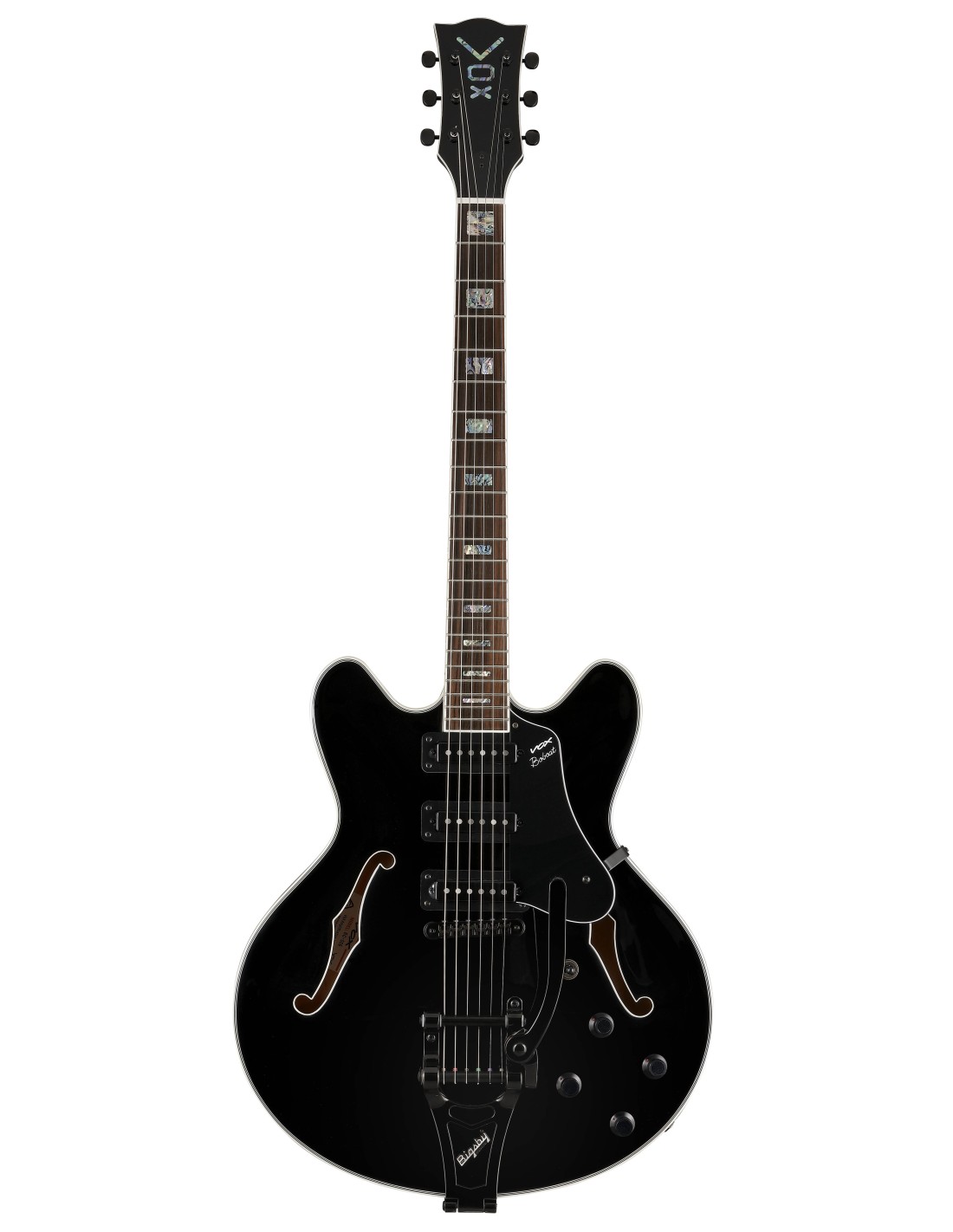 GUITARRA DE CUERPO SEMI-HUECO Guitarra Bobcat S66 con puente tailpiece con Bigsby. Este puente con Bigsby fue introducido en las guitarras en la década de 1940 y desde entonces ha sido un estándar dominante, utilizado en guitarras de muchos fabricantes. Probablemente el mayor mérito del Bigsby es cómo cautiva a los intérpretes a primera vista, con su aspecto rústico. En términos de sonido, al añadir el Bigsby a una guitarra aporta un brillo característico en el tono, con un sonido fuerte y con presencia. La Bobcat S66 es una guitarra de cuerpo semi-hollow con 3 pastillas single coil S66. Con un diseño vintage. Golpeador y pastilla basado en el diseño original. Potenciómetros de aluminio como los originales. Logo VOX vertical en la pala como los modelos de los 60. Mástil set-neck. Puente tailpiece con Bigsby. Nuevas pastillas con una estética y sonidos retro. Imanes tipo Strat para un sonido brillante y con pegada. Cuerpo de arce. Bloque central de abeto. Mástil de caoba. Diapasón de ébano de Indonesia. 2 controles de volumen y 2 de tono. Peso: 3kg. Acabado Jet Black.