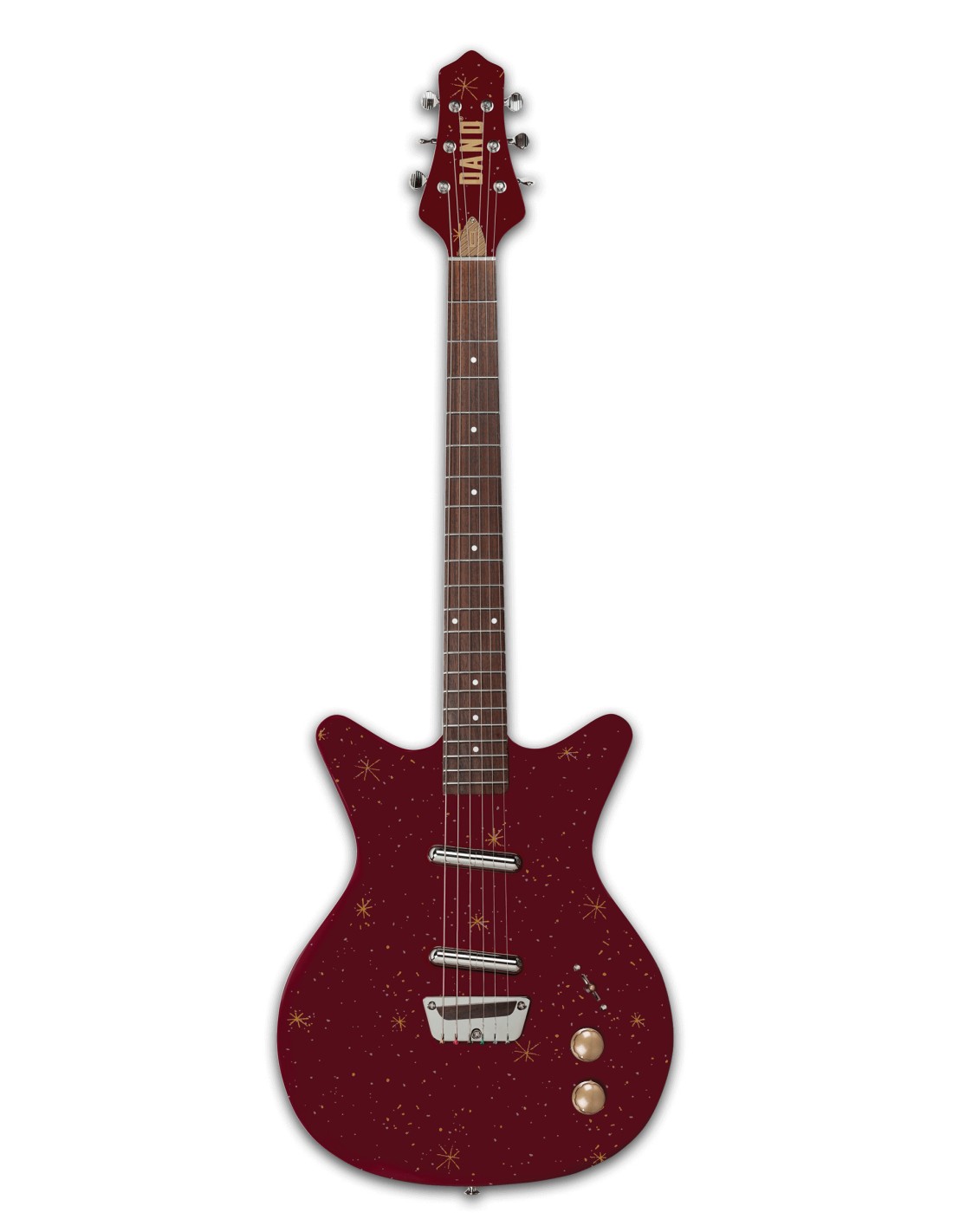 GUITARRA ELÉCTRICA RETRO 'Guitarra eléctrica estilo años 50 con forma Shorthorn doble cutaway, escala 25'', 21 trastes y pala Full Bell. Equipada con 2 pastillas Lipstick, puente de palisandro estilo 1954 con opción ajustable, controles de volumen y tono y selector de 3 posiciones. Acabado Maroon.'
