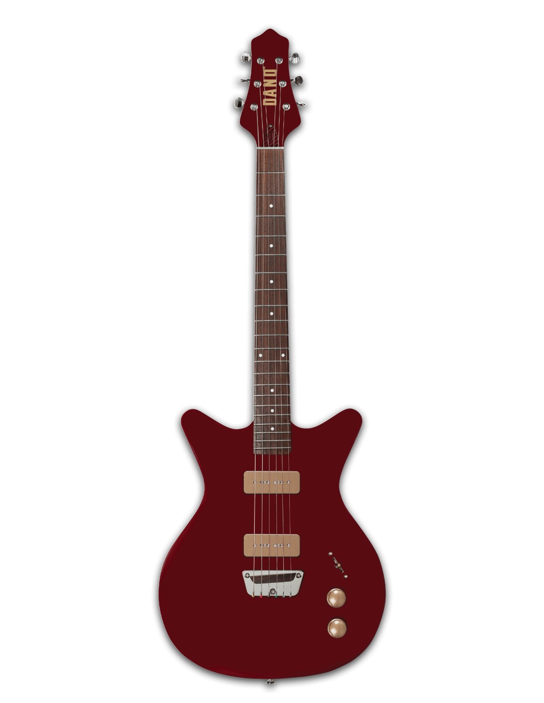 GUITARRA ELÉCTRICA RETRO 'Guitarra eléctrica estilo retro años 50 con forma Shorthorn doble cutaway, escala 25'', 21 trastes y pala Full Bell. Incorpora 2 pastillas P90 para un sonido cálido y potente, puente de palisandro estilo 1954 con opción ajustable, controles de volumen y tono y selector de 3 posiciones. Acabado Maroon.'