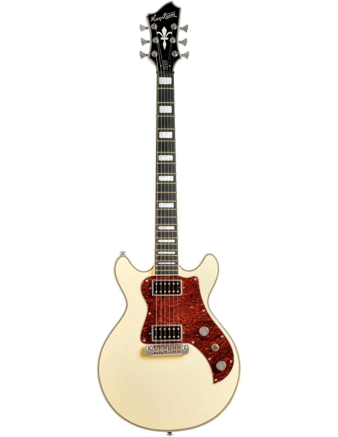 • HARDWARE: Puente Hagstrom Wrap-Around, con silletas de entonación de gran alcance, clavijas Hagstrom 15:1 Diecast Tuning Machine Heads, mandos Hagstrom MK-4H cromados y tapa de palanca.