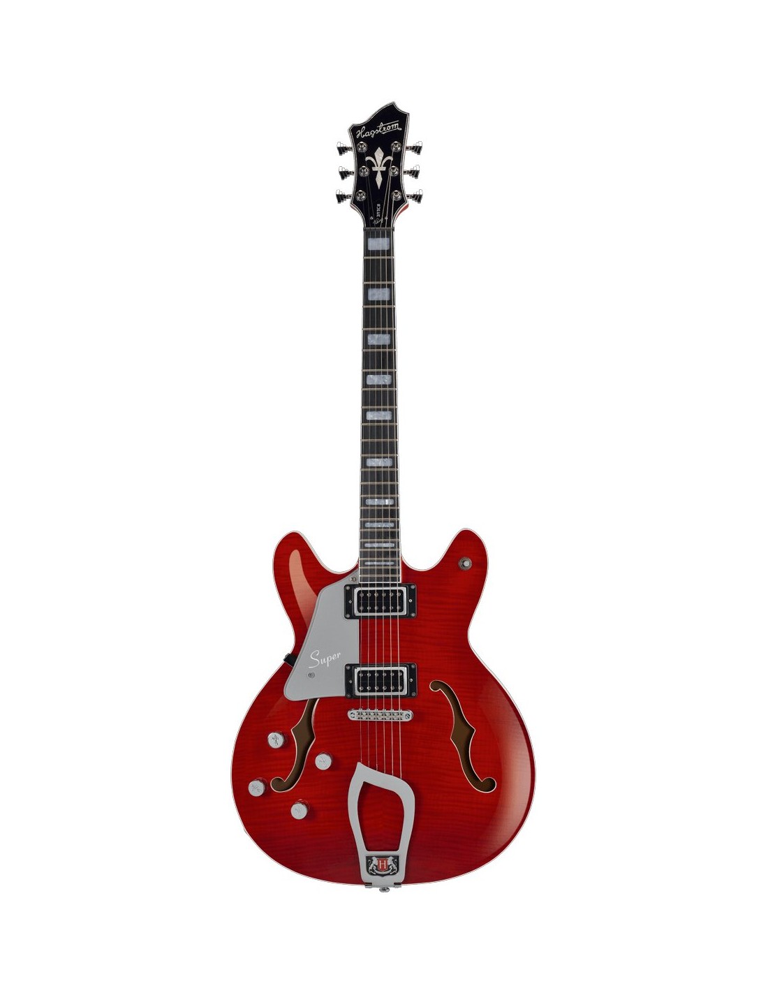 GUITARRA ELECTRICA DE 6 CUERDAS PARA ZURDOS 'Super Viking MODELO ZURDO Wild Cherry Transparent, Contoured Ply Flame Maple Semi-Hollow body, Maple Set-Neck, Long throw T-O-M Bridge, Hagstrom Trapeeze, 2 x HJ50 Alnico 5, 2 x Vol RC-Circuit, 2 x Tone (Push/Pulls - Coil Split), 3-Way Pick-up Toggle Switch, 25.50'' Scale Length, H-Expander Truss Rod, 18:1 Hagstrom Tuners, Resinator Fretboard'