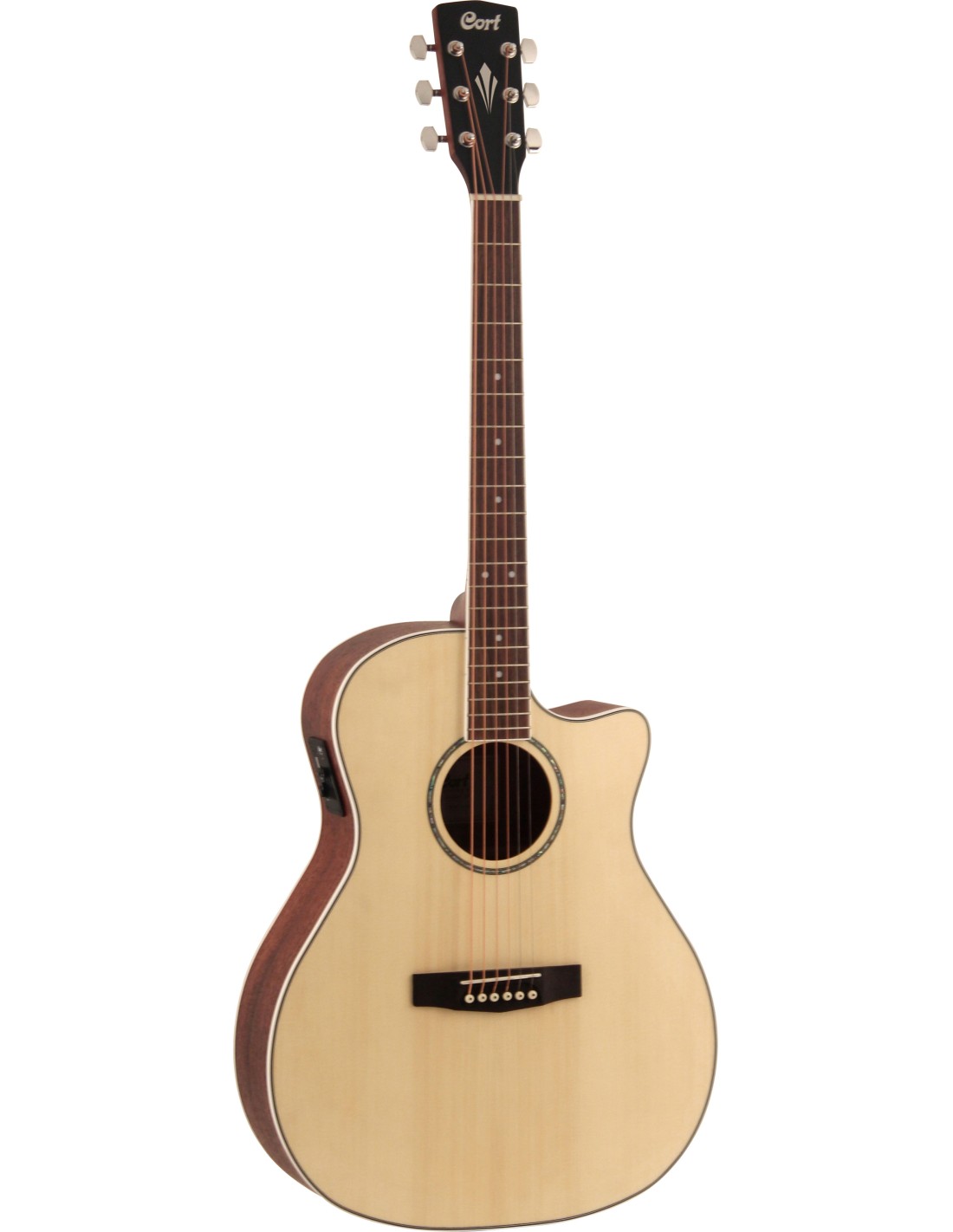 GUITARRA ELECTROACUSTICA DE 6 CUERDAS CON CUTAWAY Guitarra acústica electrificada con cutaway de tipo Grand Auditorium. Mástil de caoba con diapasón de Merbaul. Cuerpo con aros y fondo de caoba, tapalaminada de abeto. Previo Cort con afinador y EQ de 4 bandas. Acabado natural mate.