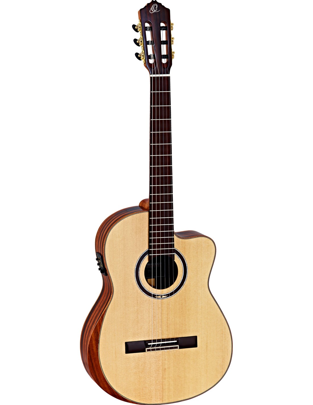 GUITARRA ELECTROACUSTICA CUERDAS DE NYLON Guitarra clásica electrificada con cutaway Private Room Series . Tapa de abeto de Sitka macizo, aros y fondo de ébano veteado, mástil de caoba . Mástil medium neck . Alma regulable. Diapasón de palisandro. Clavijero deluxe. Previo Magus Pro con afinador. Acabado Honey Sunburst. Funda y correa de piel deluxe incluidas.