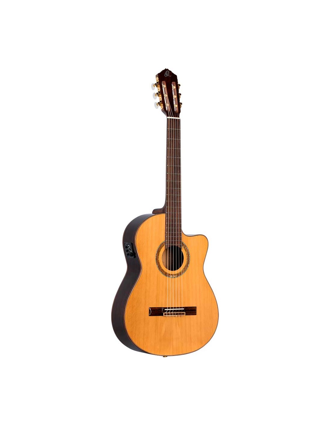 GUITARRA ELECTROACUSTICA CUERDAS DE NYLON Guitarra clásica electrificada con cutaway Feel Series . Tapa de cedro americano macizo, aros y fondo y mástil de caoba . Mástil medium neck. Alma regulable. Diapasón de palisandro. Previo Magus Pro con afinador. Acabado natural. Funda y correa deluxe incluidas.