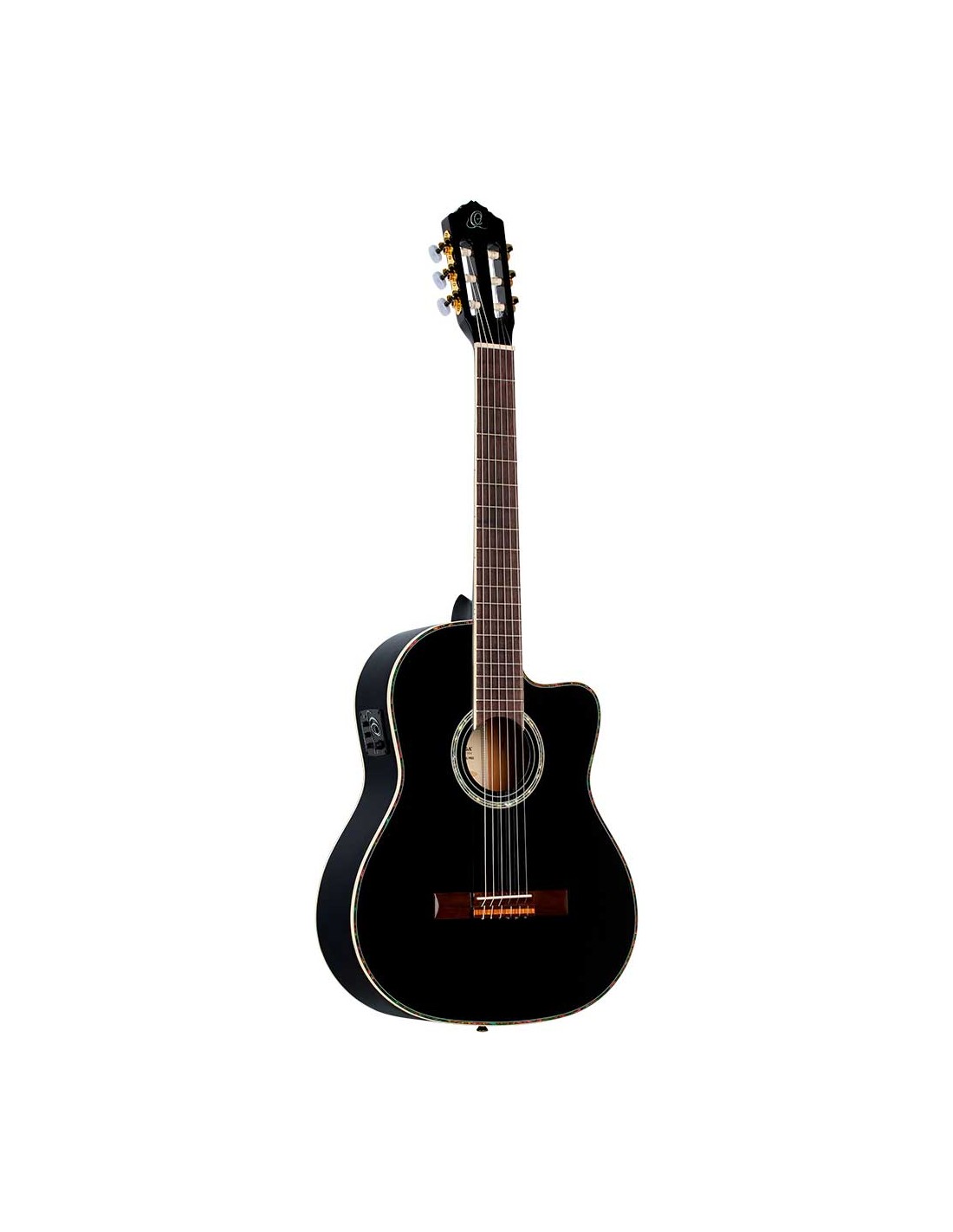 GUITARRA ELECTROACUSTICA CUERDAS DE NYLON Guitarra clásica electrificada con cutaway en color negro.
