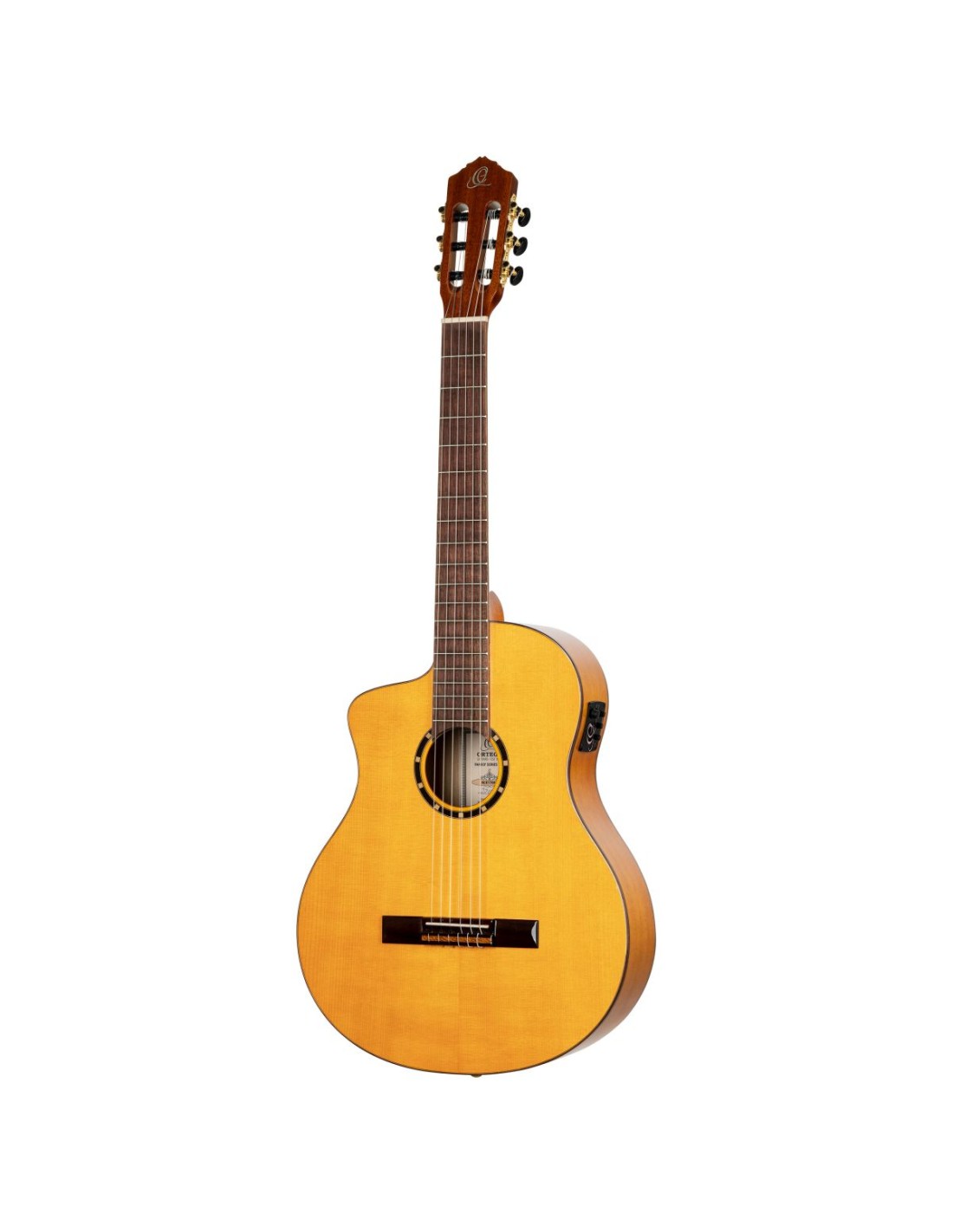 GUITARRA ELECTROACUSTICA CUERDAS DE NYLON Estos nuevos modelos de la Family Pro Series, que se inclinan más hacia el estilo flamenco, suponen un excelente comienzo para este género musical. Puede elegir entre un modelo de corte eléctrico o un modelo acústico. El tacto y la apariencia son muy similares a las guitarras flamencas tradicionales. El tono típico con un ataque rápido y agudos prominentes está asegurado por la característica combinación de madera de una tapa sólida de abeto norteamericano con un cuerpo de ciprés. Cada guitarra se entrega con una funda de lujo de Ortega y una lámina de protección dividida reutilizable.