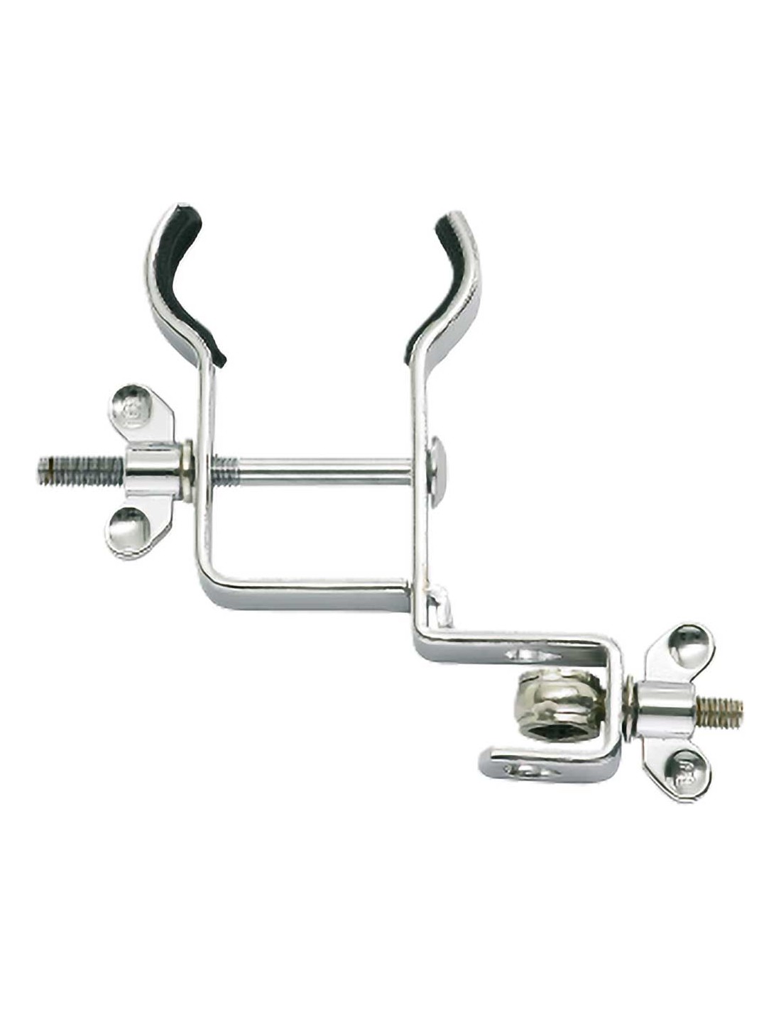 HERRAJE PARA PERCUSION Soporte para güiro MC-GU. Este herraje cromado de guiro se puede agregar a cualquier barra estándar. El guiro queda perfectamente fijado gracias a su superficie interna con refuerzo de goma sin peligro de rayaduras. Además la posición permitirá tocarlo con total comodidad.