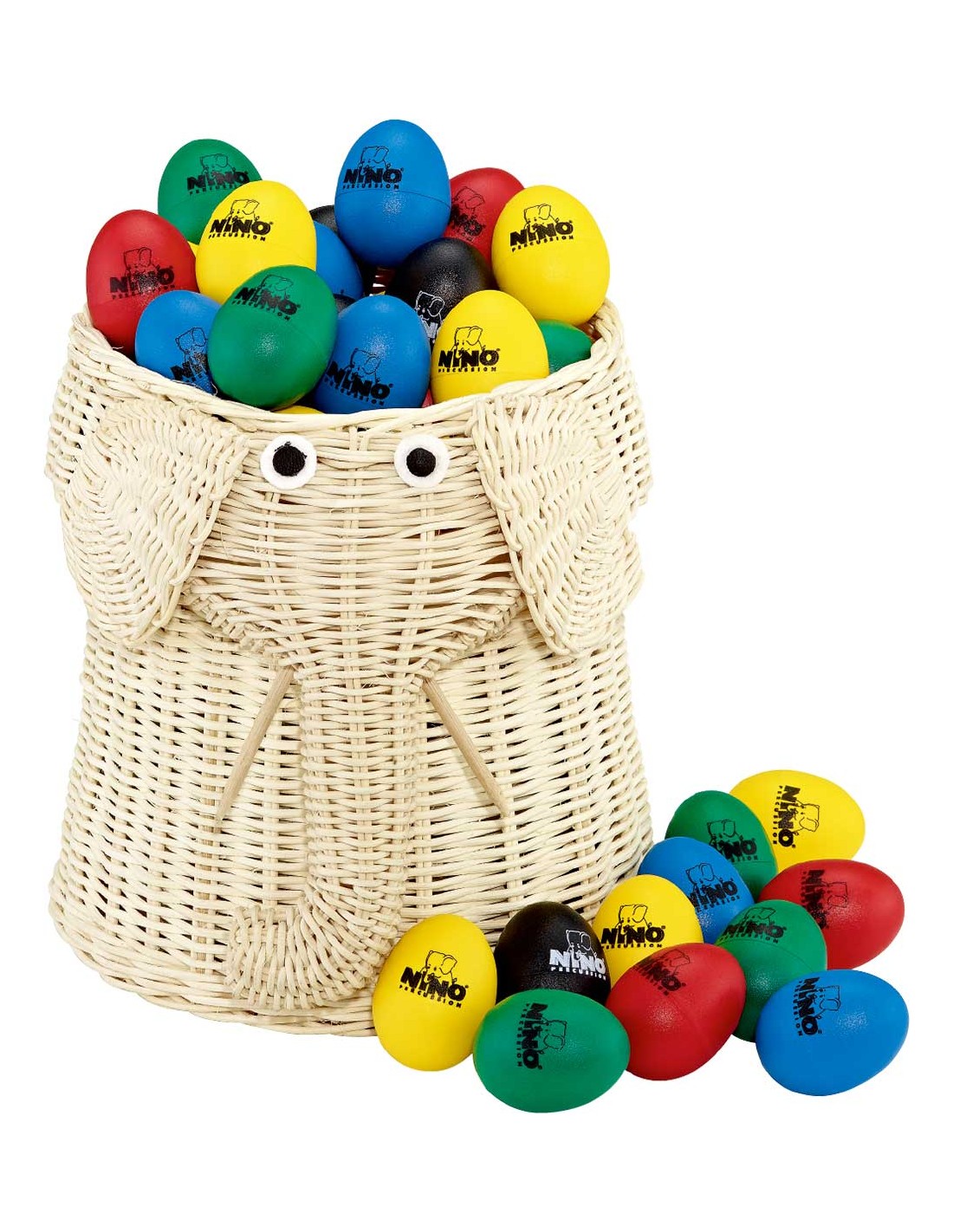 HUEVOS Elefante de mimbre lleno de huevos shaker. Incluye 25 negros, 10 verdes, 15 rojos, 15 azul, 15 amarillos y la cesta.