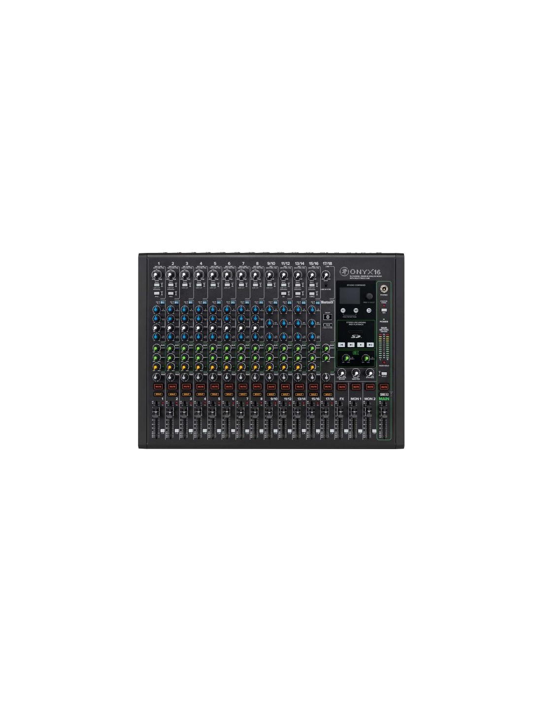 MESA DE MEZCLAS El mezclador analógico premium de 16 canales Mackie Onyx16 con USB es la solución compacta definitiva para el directo, la grabación casera y la creación de contenido. La grabación multipista de 24 bits / 96 kHz, los premiados preamplificadores de micrófono Onyx de alta ganancia y un diseño de extremo a extremo de ruido ultrabajo brindan la calidad de sonido que exigen los profesionales. Repleto de características que incluyen potentes efectos DSP, ecualizador Perkins de estilo británico, pantalla a todo color y grabación y reproducción integradas desde una tarjeta SD. El mezclador analógico premium Onyx16 le brinda la potencia que necesita para capturar su mejor rendimiento con una fidelidad impecable en casa o mientras viaja.
