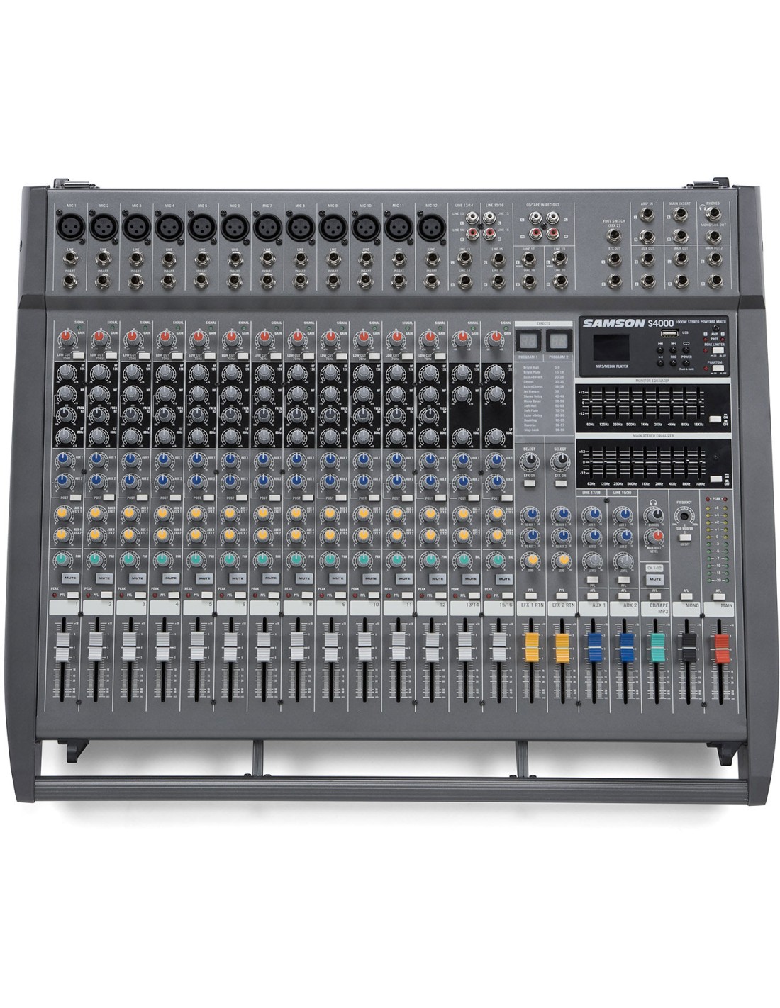 MESA DE MEZCLAS AUTOAMPLIFICADA Mesa de mezclas autoamplificada 2x 500W a 4 Ohm. 20 canales (12 mono + 4 estéreo). Integra un reproductor/grabador para memorias USB. 12 previos de micro de alta calidad. 4 Auxiliares (1 Pre, 1 Pre/Post, 2 Efectos). Procesador de efectos 24bit con 100 presets y controles de nivel FX. EQ gráfico de 9 bandas dual. Salida mono sub con filtro paso-bajo variable. Salidas: Speakon y Jack 1/4' (auriculares). Ajuste de HF y LF. Ajuste de medios avanzado. Incluye cubierta protectora.
