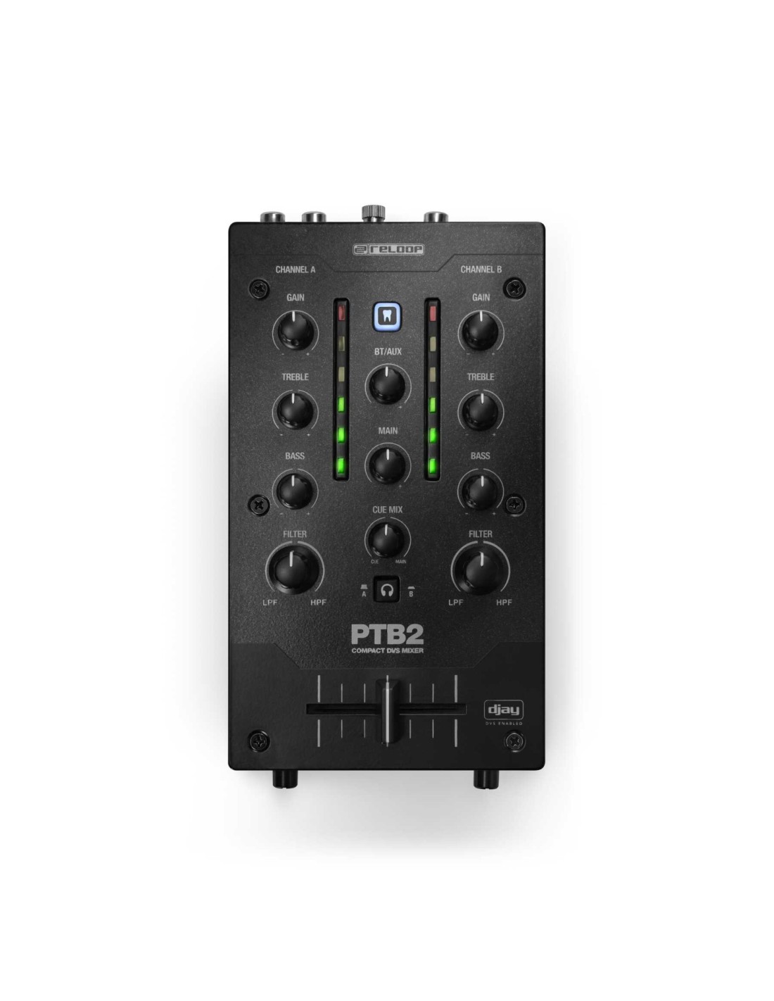Dispone de dos tiras de canal, cada una con control de ganancia, agudos, graves y filtro, junto con un crossfader Ultra Glide de 45 mm, ofreciendo un diseño clásico que resultará familiar a los DJs más experimentados. Las opciones de conexión para dos CDJ o dos platos convierten al PTB-2 en un mixer DJ completamente funcional. Combinado con platos portátiles como el Reloop SPIN, se abren nuevas posibilidades para pinchar en movimiento, sin necesidad de acceso a corriente eléctrica.