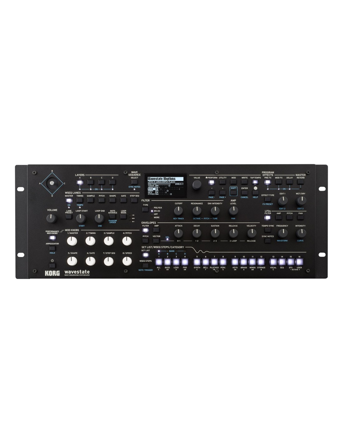 MODULO DE SONIDOS O SINTETIZADOR Presentamos el módulo wavestate: todas las funciones del wavestate mkII en un conjunto compacto de sobremesa o rack de 19 pulgadas. En 2020, el aclamado wavestate llevó el Wave Sequencing de KORG al siguiente nivel. Con el Wave Sequencing 2.0 radicalmente reimaginado, el wavestate ofrece sonidos asombrosos y siempre cambiantes con un extenso control directo. Lejos de ser una reedición nostálgica, el wavestate se diseñó desde cero para una nueva generación de músicos, productores y compositores, tomando como referencia fuentes tan diversas como los sintetizadores modulares, las groove boxes y la composición algorítmica.Especificaciones principalesPolifonía máxima120 voces estéreoDimensiones (An x Pr x Al)483 x 172 x 113 mm / 19.02 x 6.77 x 4.45 pulgadasPeso1.7 kg / 3.75 lbs.AccesoriosAdaptador AC