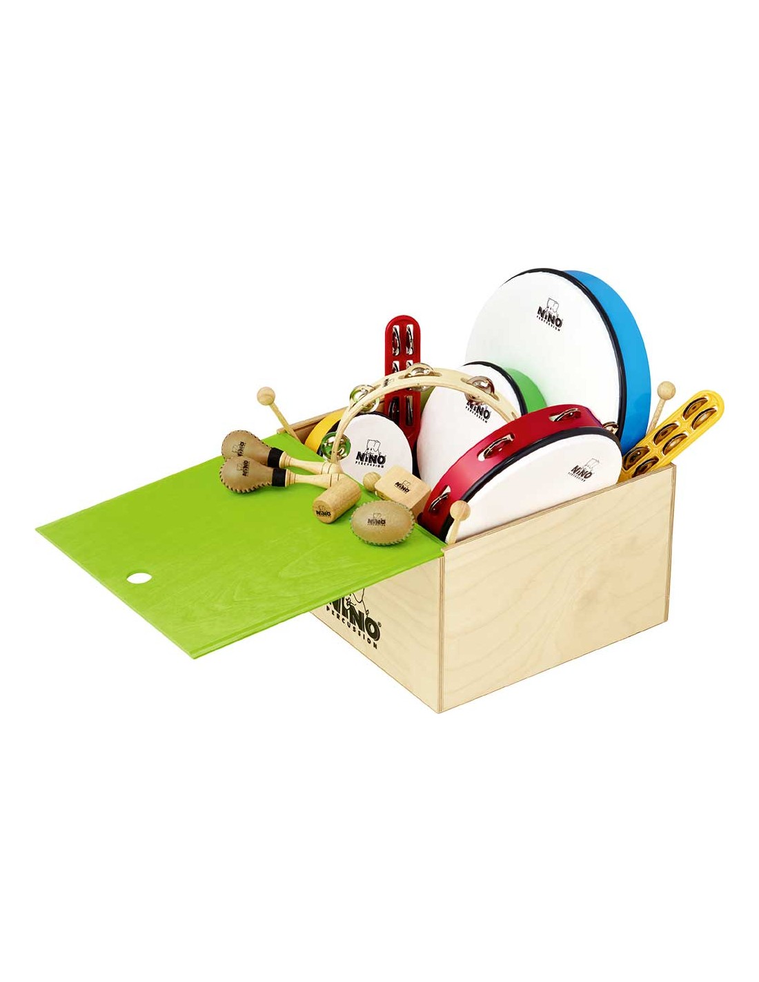 PACK DE PERCUSION DE MANO Set de de percusión que incluye 4 pandereros, maracas, 2 shakers, 2 jingle sticks, panderta de madera y sus baquetas. El set incluye caja de madera para almacenarlo.