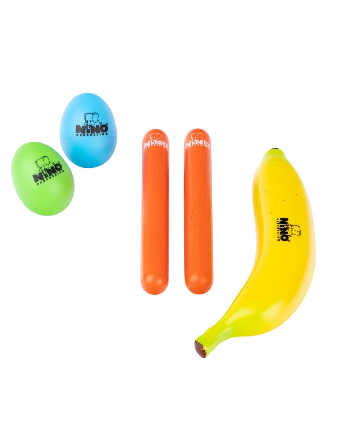 PACK DE PERCUSION DE MANO 'Obtenga una variedad de sonidos de percusi¢n en un solo pack con los sets mixtos de instrumentos de Nino Percussion. Ideal para aulas o en casa, cada pack contiene una combinaci¢n de piezas dise¤adas para ayudar a ense¤ar a los j¢venes m£sicos los elementos de la percusi¢n con el uso pr ctico de instrumentos r¡tmicos reales y divertidos de tocar. pack de ritmo: 4 piezas. Set Para Aulas O En Casa Incluye: 2 x batidora de huevos (verde hierba, azul cielo) 1 x batidora de pl tanos 1 par de claves de madera (naranja) Material: batidora: ABS Claves: Siam Oak (Hevea brasiliensis Muell.-Arg.) Relleno ( coctelera): peque¤as bolas de acero, libres de qu¡micos nocivos como plomo o cadmio Medidas: coctelera de huevos: 5,5 cm (L), 4,2 cm coctelera de pl tanos: 20 cm (L), 4,5 cm claves:15,5 cm (L), 2 cm Medidas en pulgadas: egg shakers: 2,17'' (L), 1,65'' banana shaker: 7,9'' (L), 1,77'' claves: 6,1'' (L), 0,79'' Jugadores: para 4 ni¤os'