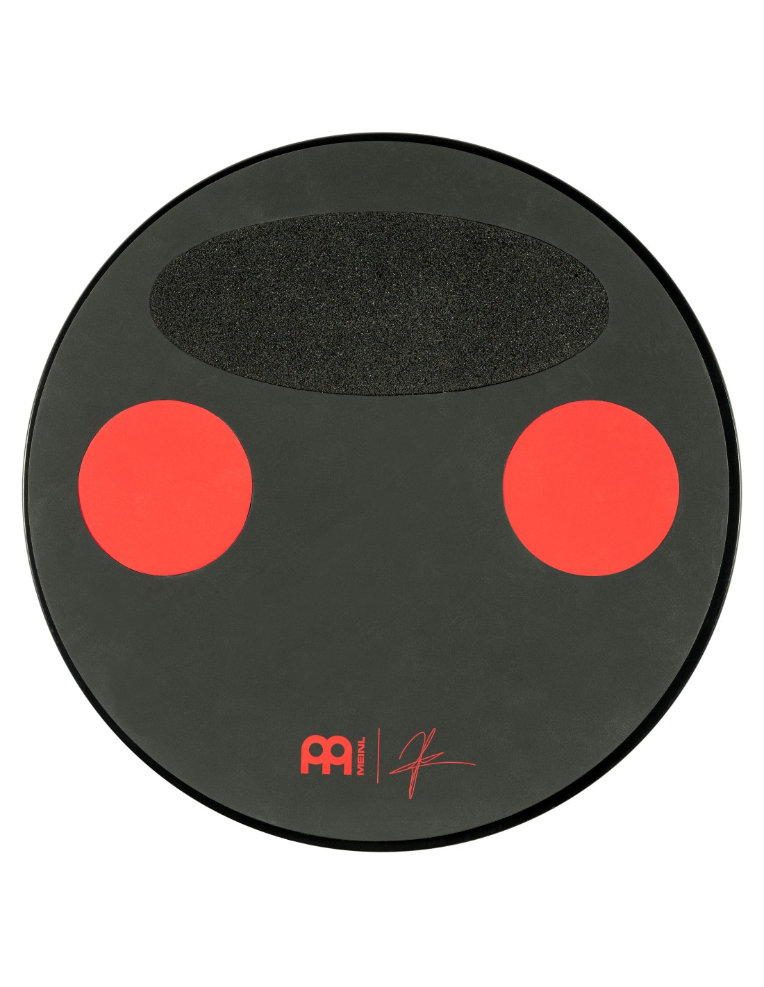 PAD DE PRACTICA 'Pad prácticas MSTP. Este pad, diseñado por Anika Nilles, te permite llevar tu forma de estudio a un nivel superior ya que podrás combinar las distintas respuestas de sus tres zonas consiguiendo mejoras en tu precisión, dinámica y tratamiento de cada uno de tus sonidos. El punto diferencial del pad es que te permite entender mucho mejor los ejercicios por la diferencia sonora al realizarlos. La parte negra y central es un pad clásico. Los dos puntos rojos tienen un tono más alto y en la parte oval superior es prácticamente inaudible pero con rebote. Permitiéndote concentrarte en los golpes que des fuera de esta superficie. Para rematar, la parte inferior del pad es muy blanda y perfecta tanto para calentar como para que siente en superficies que no sean totalmente planas.