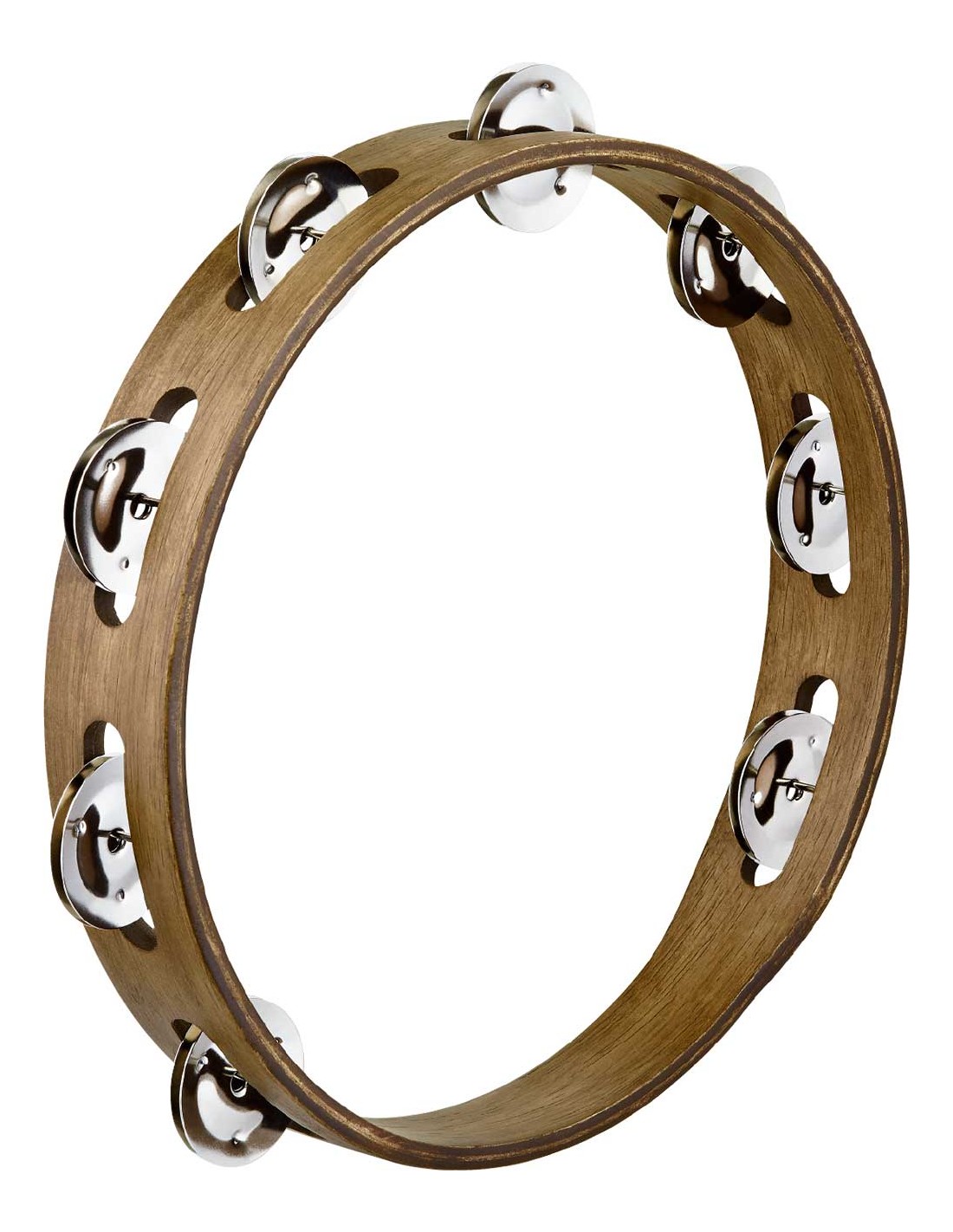 PANDERETA SIN PARCHE 'Pandereta de madera 10'' de 1 hilera, con sonajas de acero. andereta de madera. 25,4 cm de diámetro. Diseño vintage, acabado en color marrón nogal.
