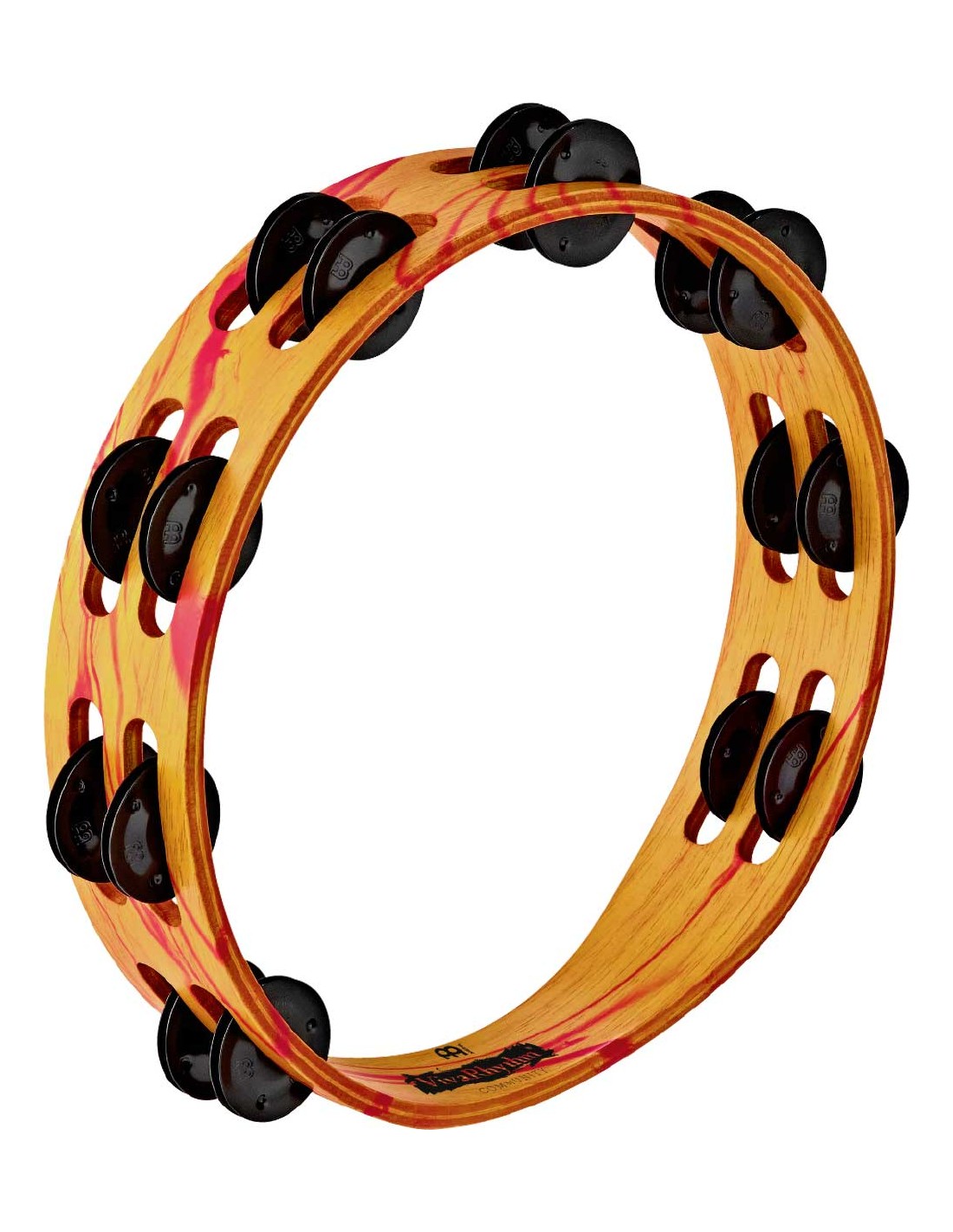 PANDERETA SIN PARCHE Pandereta, 2 rows, red/orange marble finish, black plated steel jingles. La pandera Viva Rhythm es viva tanto en acabado como en sonido. Sus dos filas de crótalos negro le dan una sonoridad gigante y una presencia espectacular.