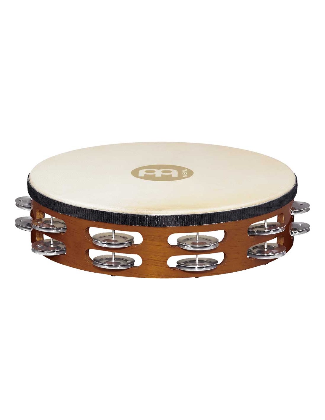 PANDERETA CON PARCHE 'Pandereta de madera 10'' con parche natrual pretensado y 2 hileras de sonajas de aluminio. Pandereta de madera de 25,4 cm de diámetro. Diseño vintage, acabado en color marrón nogal.