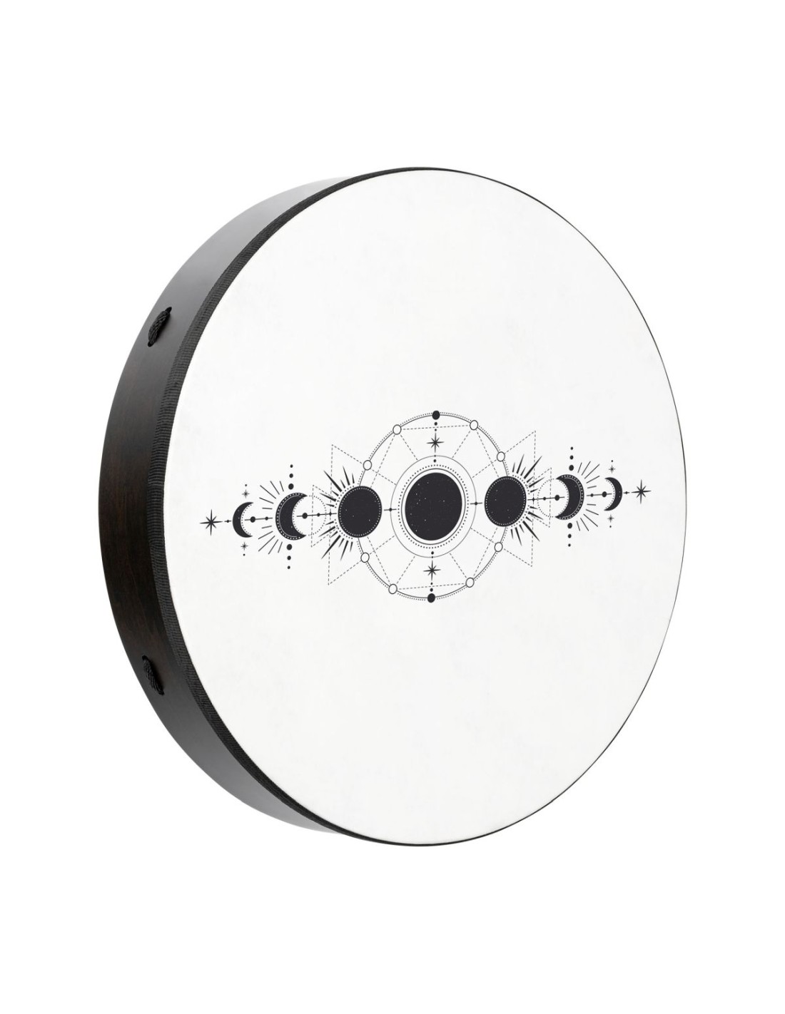 PANDERO / PANDERETA 'Los tambores Meinl Sonic Energy Ritual Drums garantizan una resonancia notable que atrae sus sentidos durante baños de sonido, toma de tierra o sesiones musicales. La calidez innata y la profunda riqueza tonal transforman cada golpe en un encuentro fascinante, que abarca surcos rítmicos hasta latidos similares a los de un corazón. Da rienda suelta a tu creatividad y forja tus ritmos únicos usando el mazo provisto, mientras exploras el cautivador potencial de estos tambores. Cordón cruzado para un perfecto agarre,,Tonos profundos y cálidos,,Perfecto para sesiones de conexión a tierra y baños sonoros,,Símbolo de las fases de la luna,,Vegano. Tamaños20'' x 3,5'', 50,8 cm x 8,9 cm'