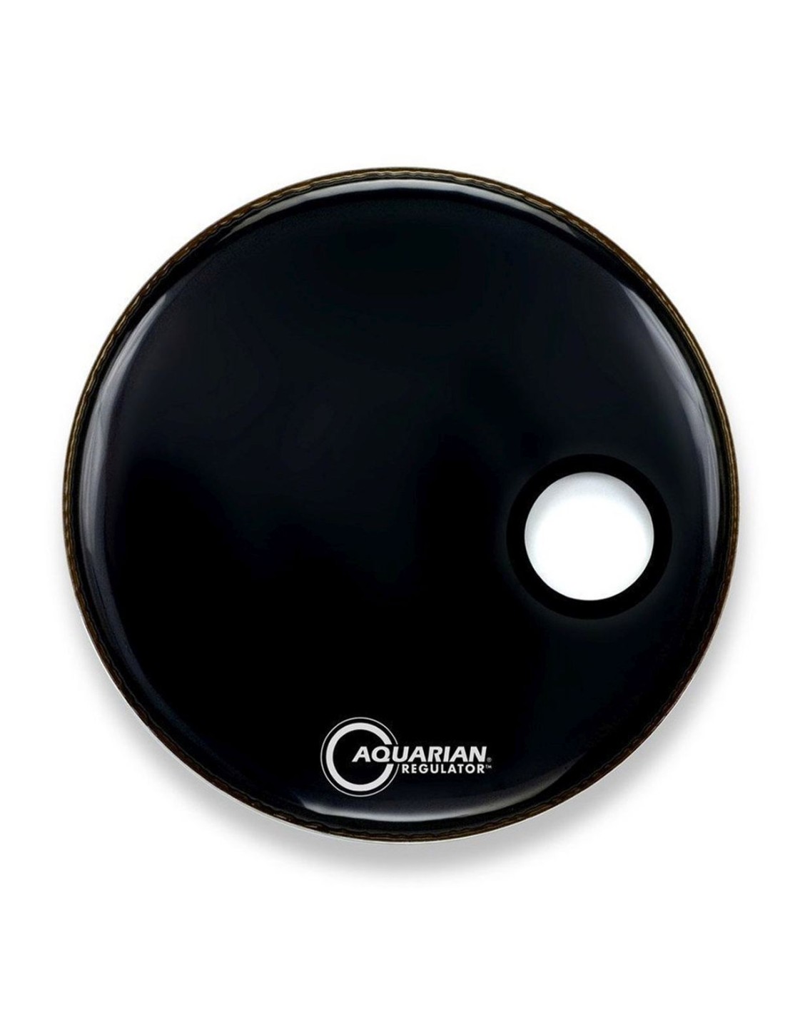 PARCHE DE BOMBO 'Parche frontal de una capa medium (10 mil). Tiene un muffle con agujeros de ventilación que le permite moverse y resonar con el parche dándole un tono especial. Controlan los armónicos y las frecuencias altas. Con agujero 4 3/4''. En negro. 18''.'