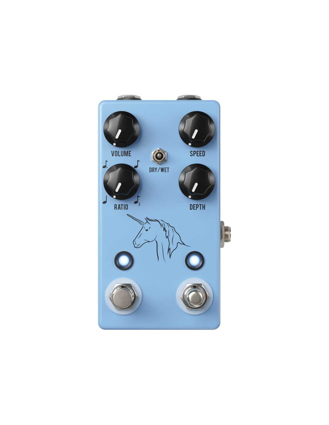 PEDAL DE VIBRATO Un circuito inspirado en el pedal Uni-Vibe de los 60 pero con Tap Tempo para controlar la velocidad y ajustar el LFO. Podrás manipular el Tap Tempo con un pedal de expresión externo sin influir sobre el recorrido de audio analógico ni en la célula fotoeléctrica. Control Volume hasta 9dB de boost. Control Depth para la mezcla. Control Ratio con 4 velocidades y selector Dry/Wet para que tengas un predeterminado nivel de señal sin efecto (como el Uni-Vibe) o un sonido solo de vibrato. Entrada Tap/Exp para conectar un pedal de expresión TRS combinable con un selector interno para que controles el efecto desde fuera. Con la posición Tap Out podrás conectar el Unicorn a cualquier otro pedal que desees manipular su tempo y utilizar un pedal para controlar el tempo del otro. Esta nueva versión es igual que la primera pero con la mitad de tamaño.